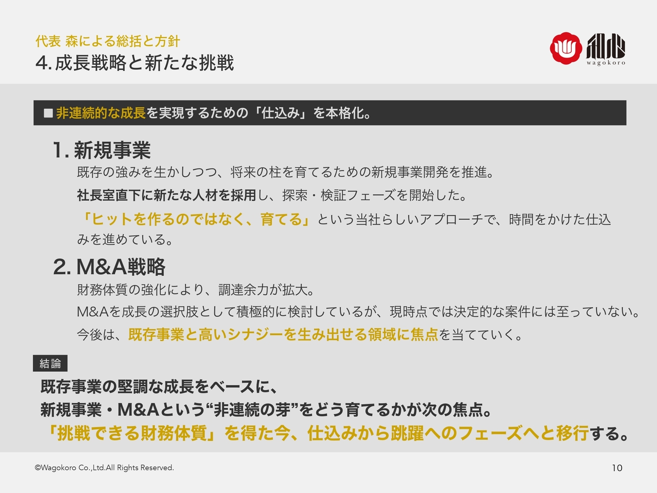 結論として、既存事業の堅調な成長を基盤としつつ、新規事業とM&Aという非連続的な成長の芽をどのように育てていくかが次の焦点となっています。「挑戦できる財務体質」を得た今、当社は仕込みから跳躍へのフェーズへと移行しています。