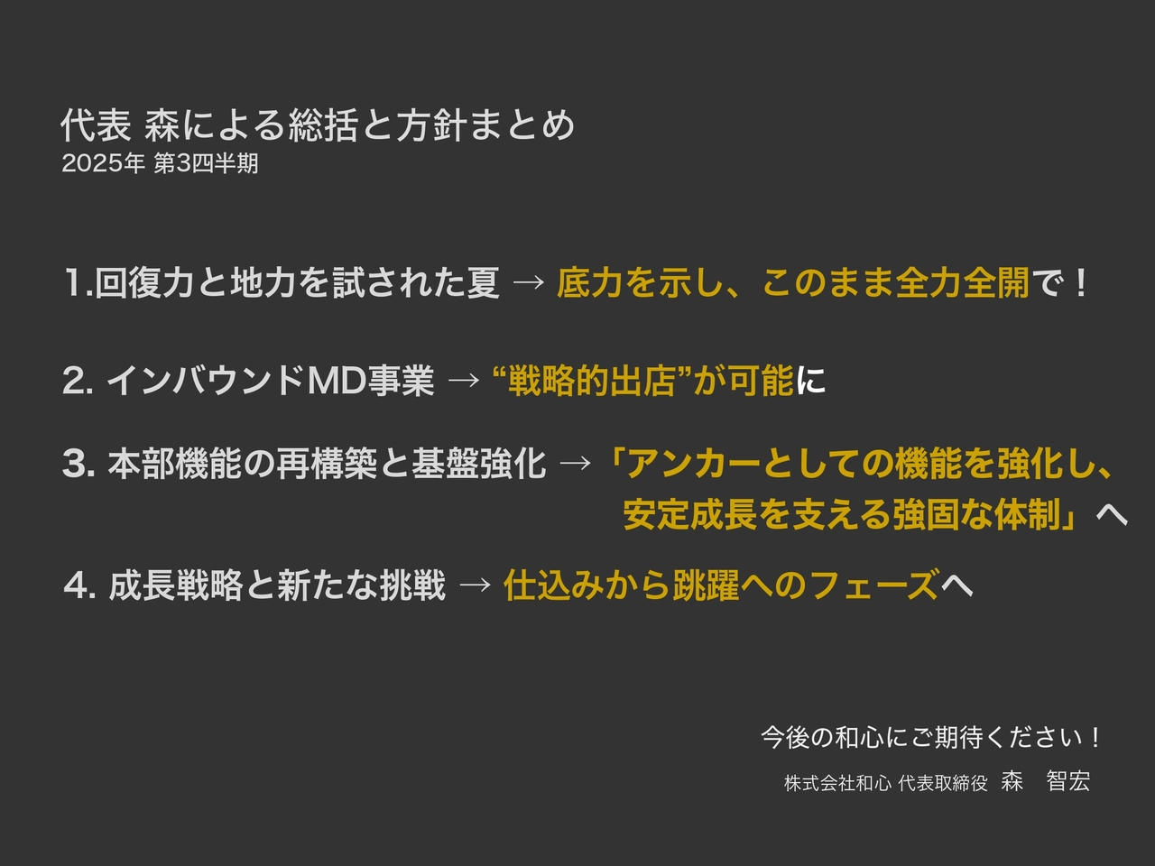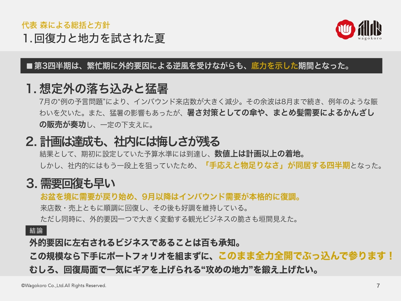 総括と方針についてまとめると、第3四半期においては、「回復力と地力を試された夏」でしたが、底力を発揮し、今後も全力で取り組みます。