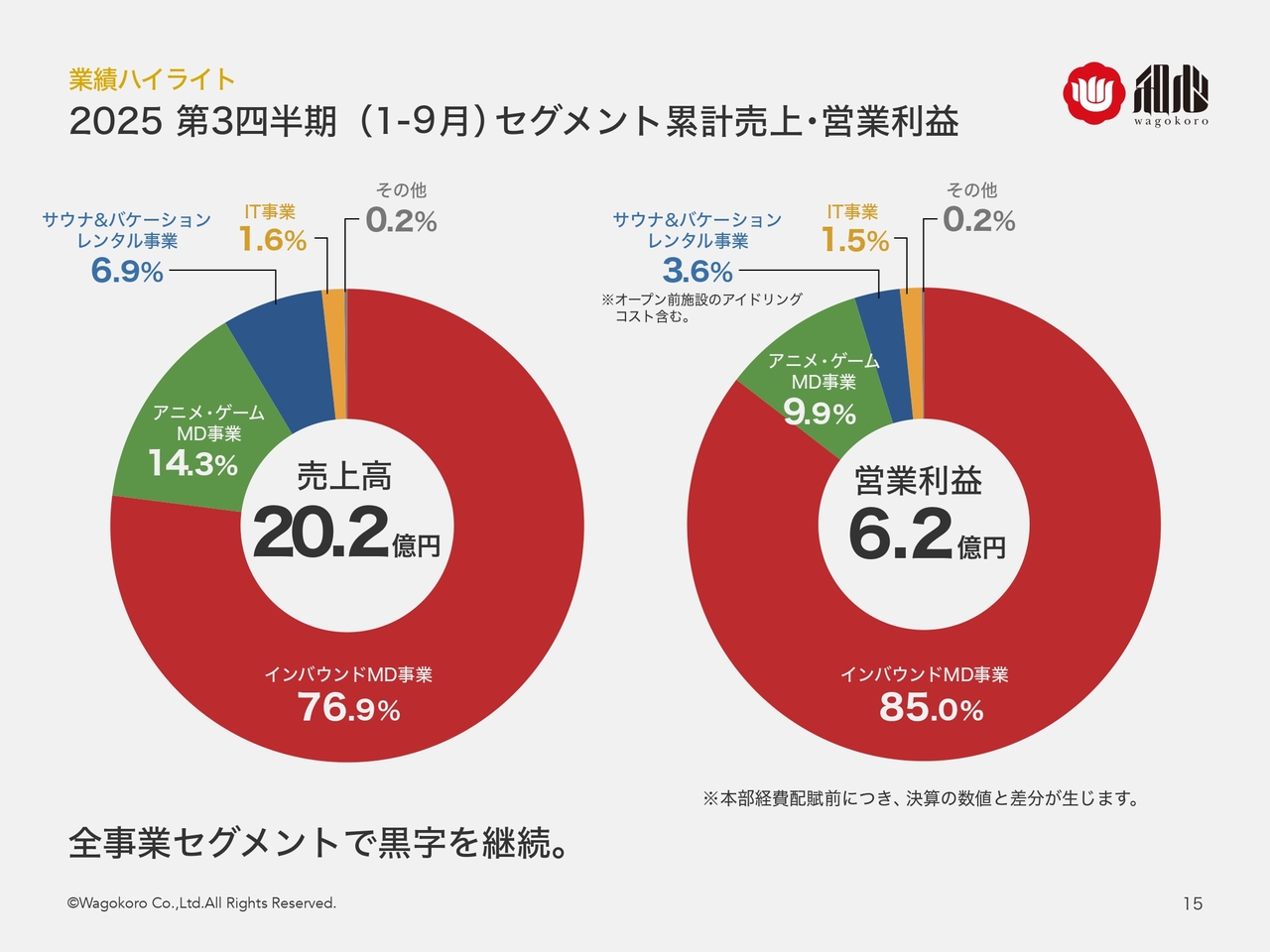 営業利益は合計6億2,000万円で、構成比はインバウンドMD事業が85.0パーセント、アニメ・ゲームMD事業が9.9パーセント、サウナ&バケーションレンタル事業が3.6パーセント、IT事業が1.5パーセント、その他が0.2パーセントです。