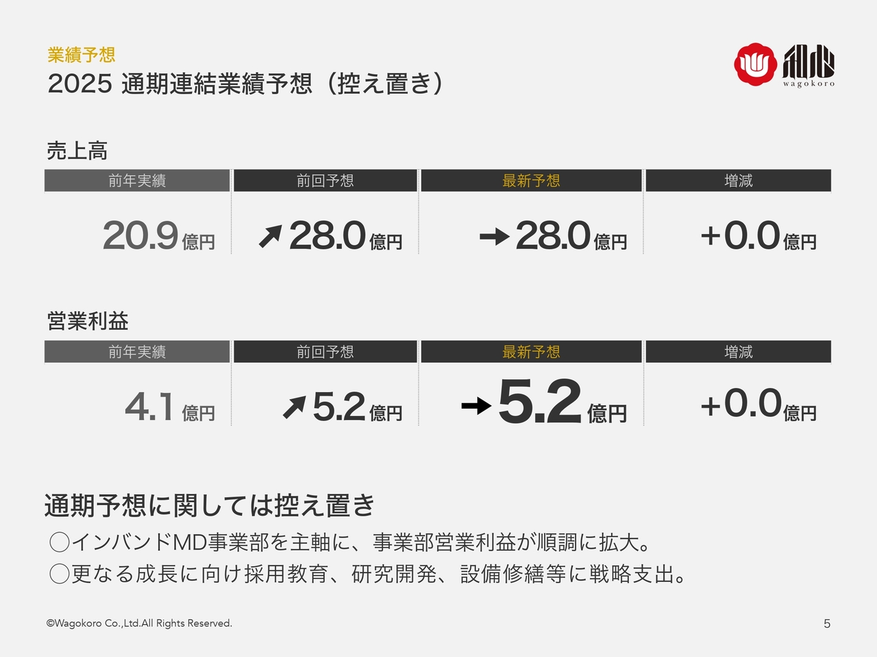 通期予想が控え置きとされている背景には、インバウンドMD事業部を主軸とした事業部営業利益の順調に拡大しつつも、さらなる成長を見据えた採用教育、研究開発、設備修繕などへの戦略的な支出があることが要因となります。