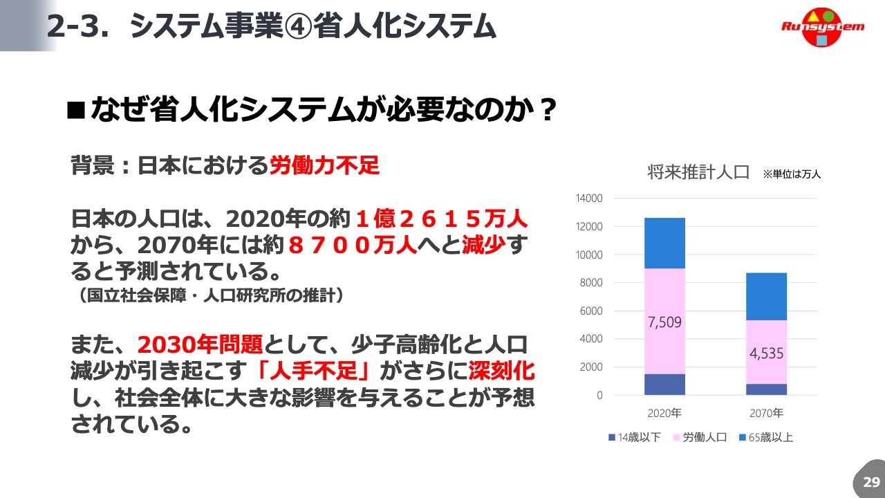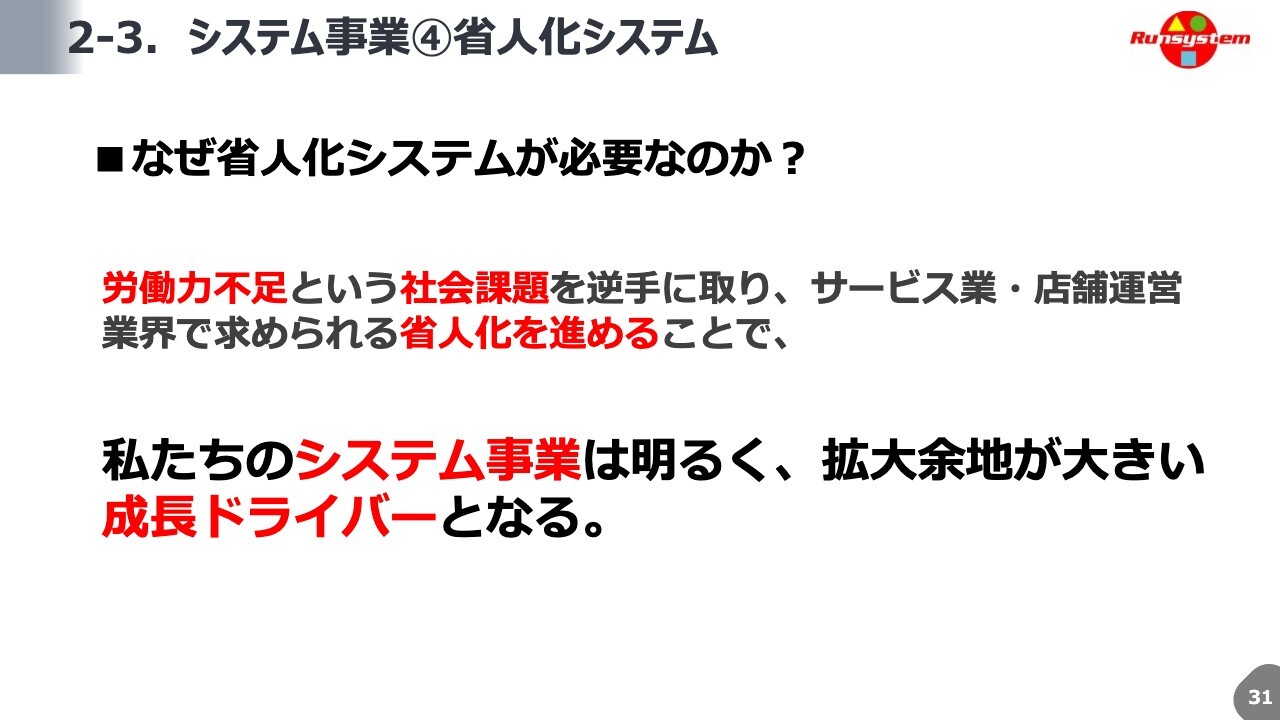 省人化システムの必要性についてまとめますと、労働力不足という社会課題を逆手に取り、サービス業や店舗運営業界で求められる省人化を進めることが、システム事業の成長につながると考えています。
