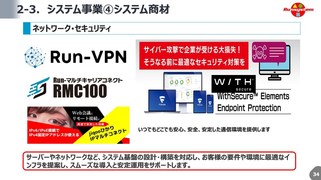 また、ネットワーク・セキュリティ分野では「Run-VPN」などがあります。当社はこの部門にも専門のスタッフを配置しており、得意分野としてしっかりと対応を進めています。