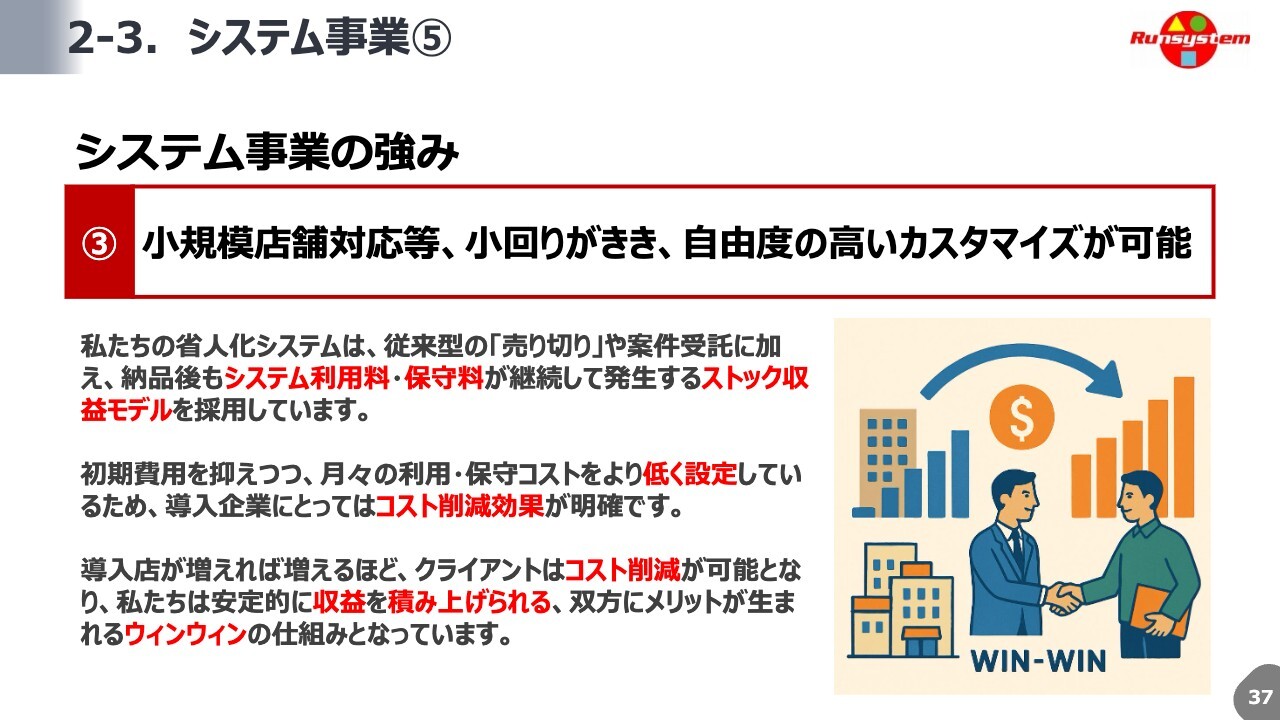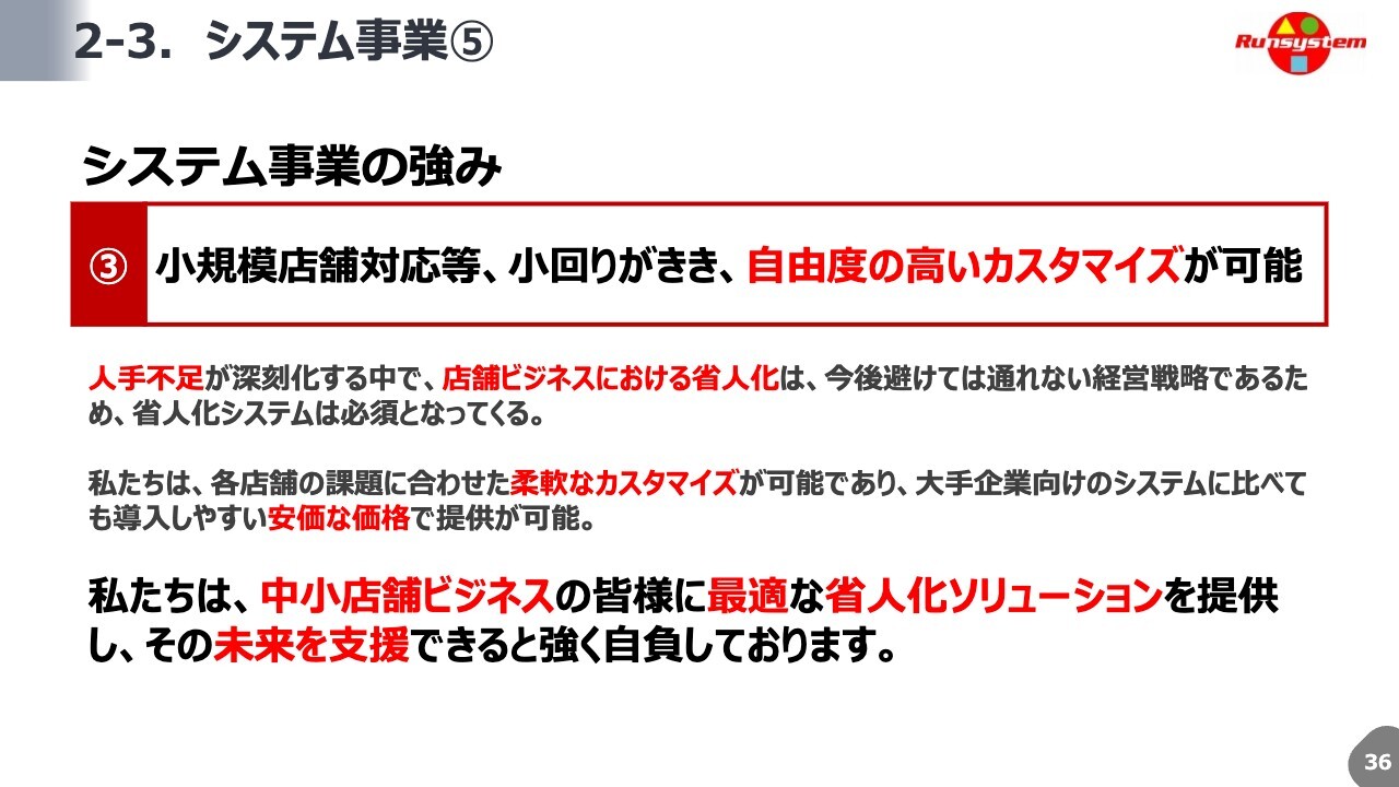 システム事業の3つ目の強みは、小規模店舗対応等、小回りがきき、自由度の高いカスタマイズが可能である点です。