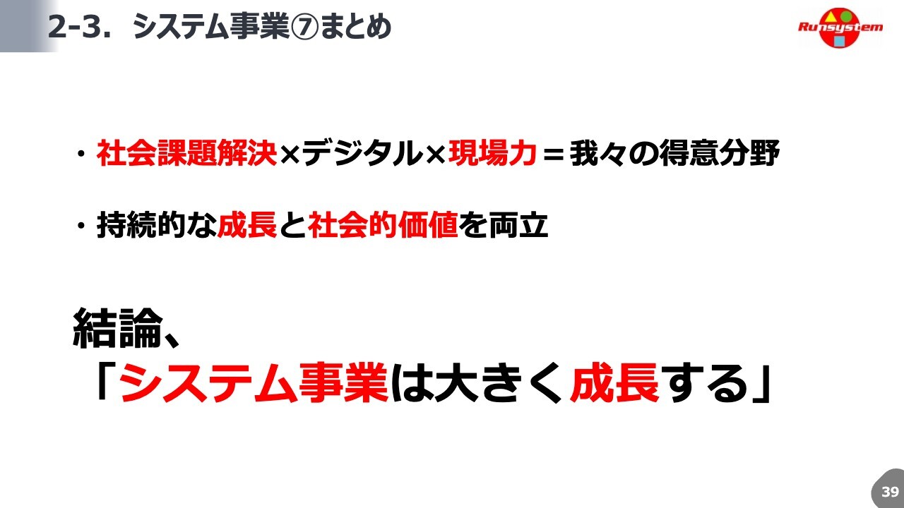 システム事業についてまとめると、社会課題解決×デジタル×現場力は、私たちの得意分野であり、持続的な成長と社会的価値の創出を両立している事業だと自負しています。