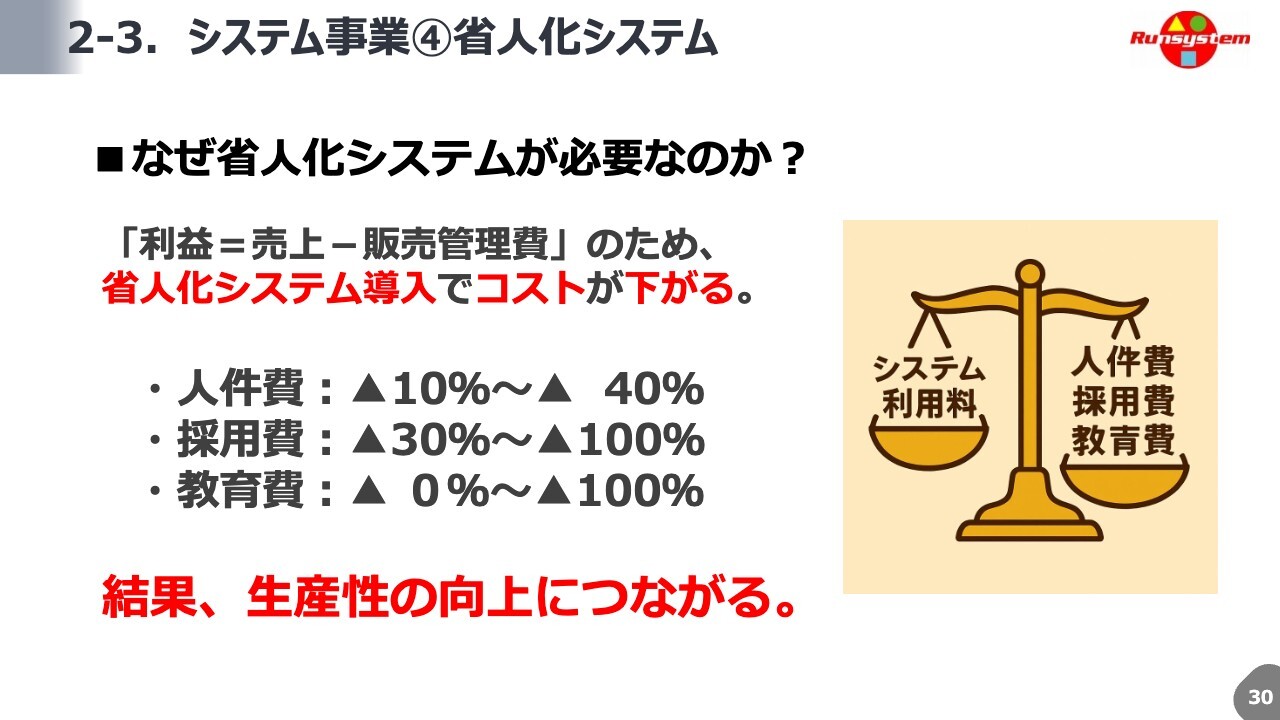 省人化システムの商品化・導入によるコストの削減について、店舗によって異なりますが、当社の店舗運営の実績では、人件費が約10パーセントから40パーセント、採用費が30パーセントから100パーセント、教育費が0パーセントから100パーセント削減可能です。