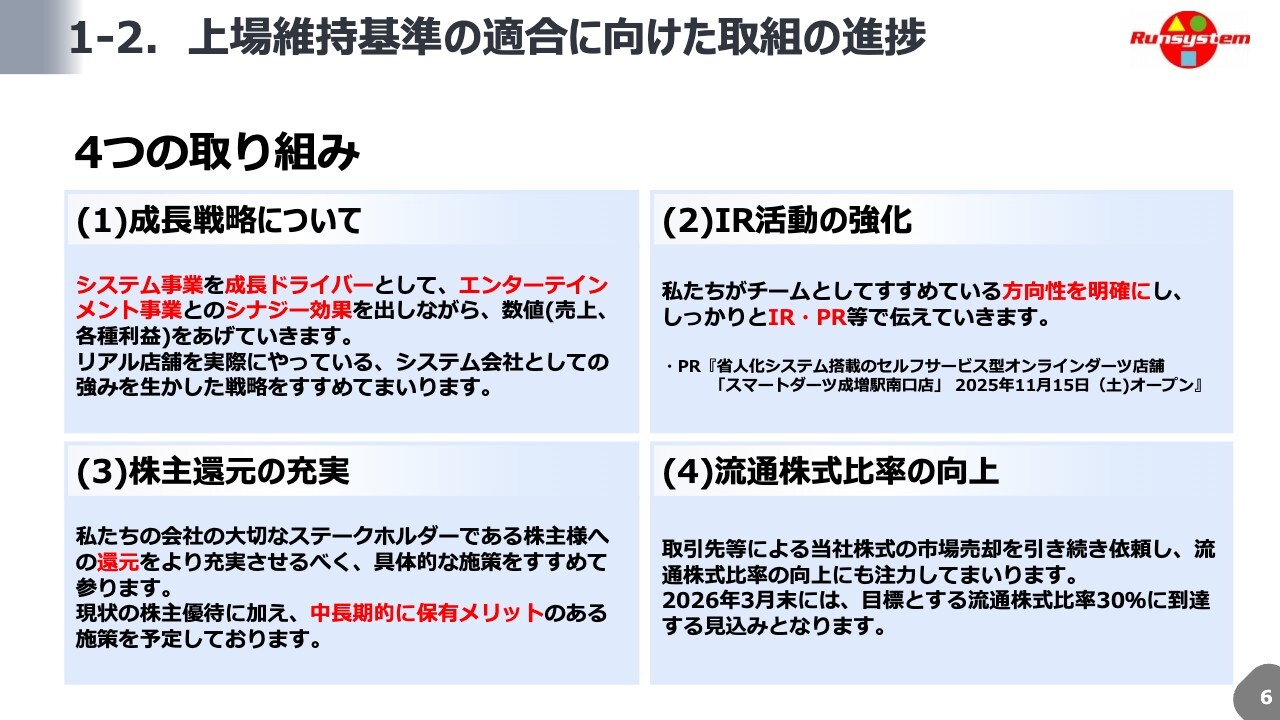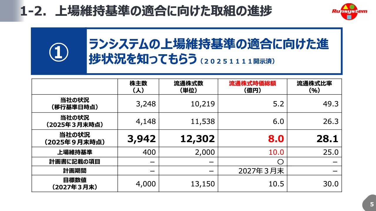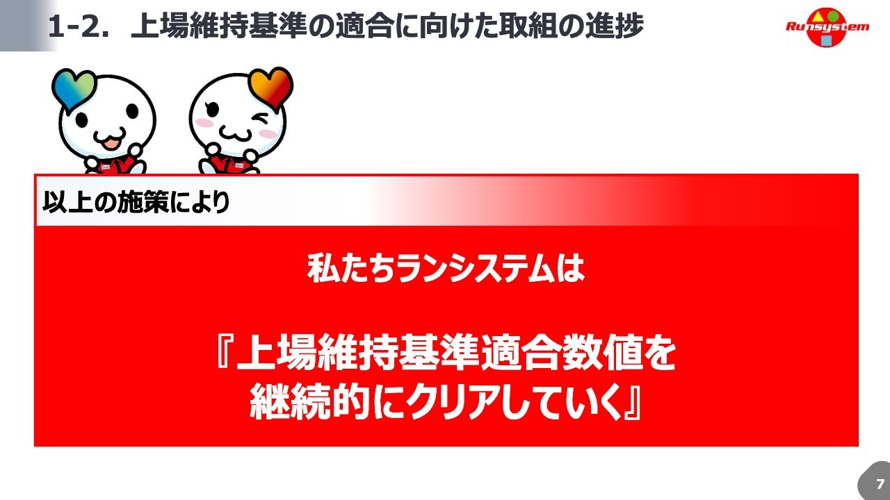 ゴールの1つ目である、ランシステムの上場維持基準適合に向けた進捗状況についてご説明します。