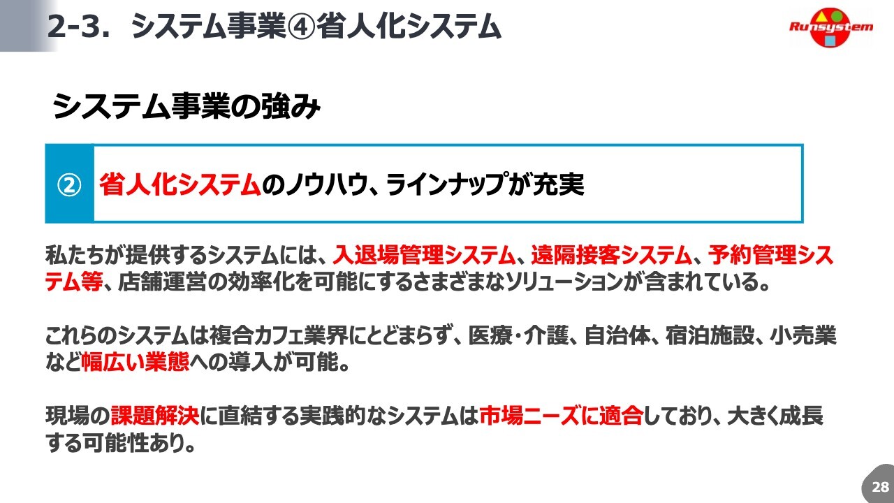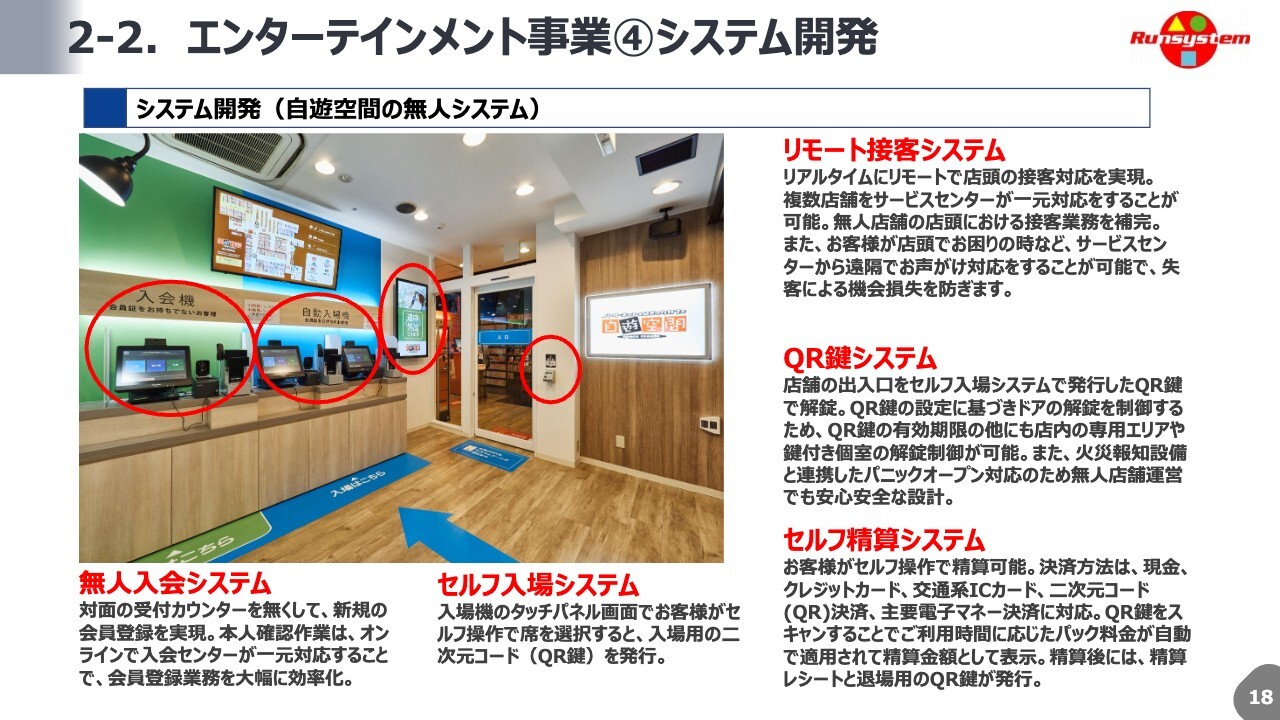 具体的には、システム事業を成長のドライバーとし、エンターテインメント事業とのシナジー効果を活用しながら、着実に数字を伸ばしていきます。また、複合カフェ「自遊空間」を運営しているシステム会社としての強みを活かし、戦略を進めていきます。