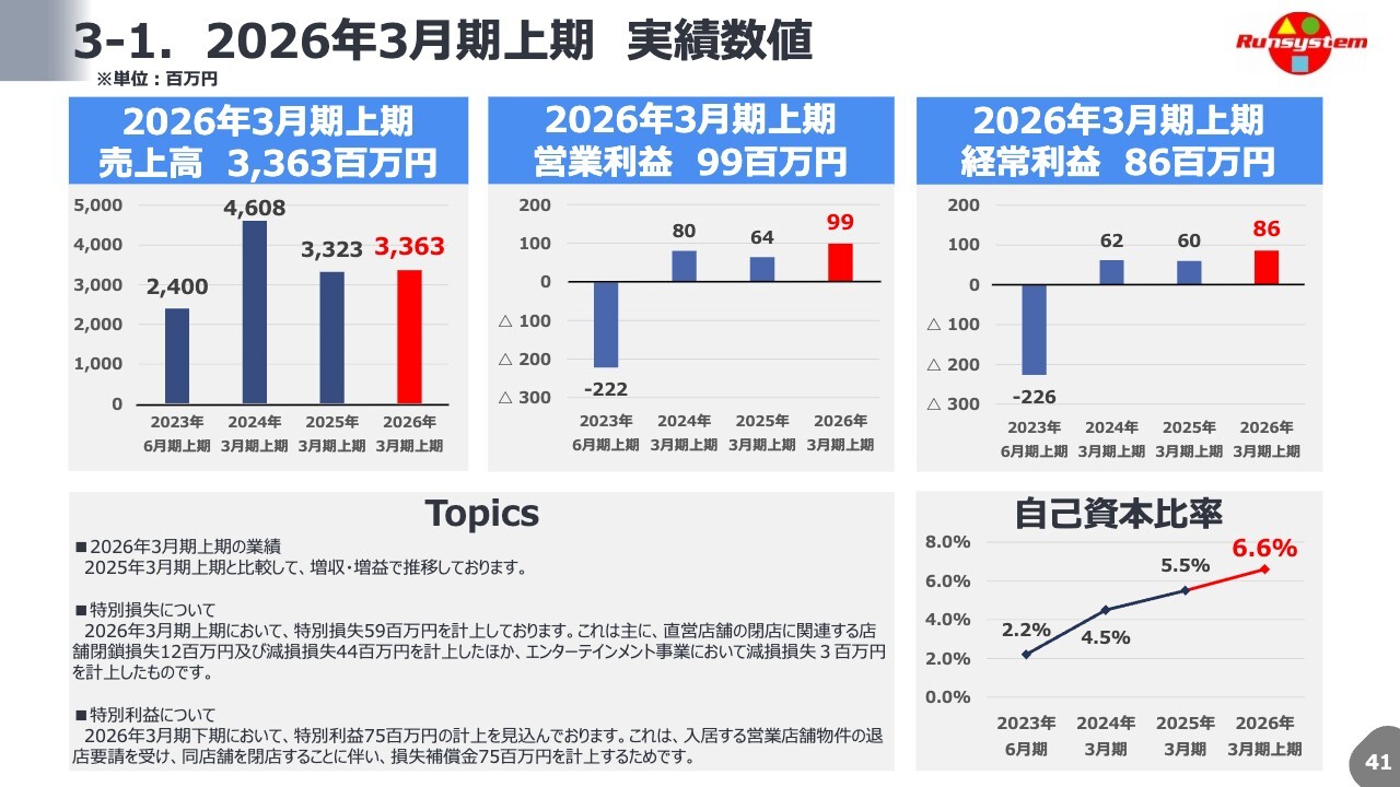 2026年3月期上期実績についてご説明します。売上高は33億6,300万円、営業利益は9,900万円、経常利益は8,600万円で、順調に推移しています。数字の詳細についてはスライド41ページをご確認ください。