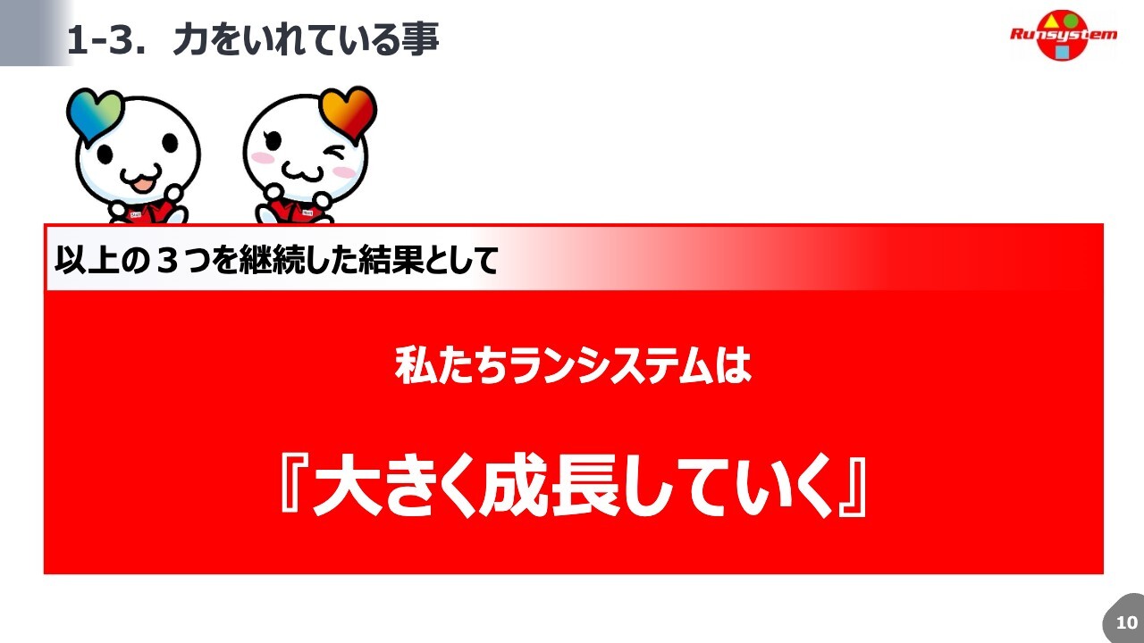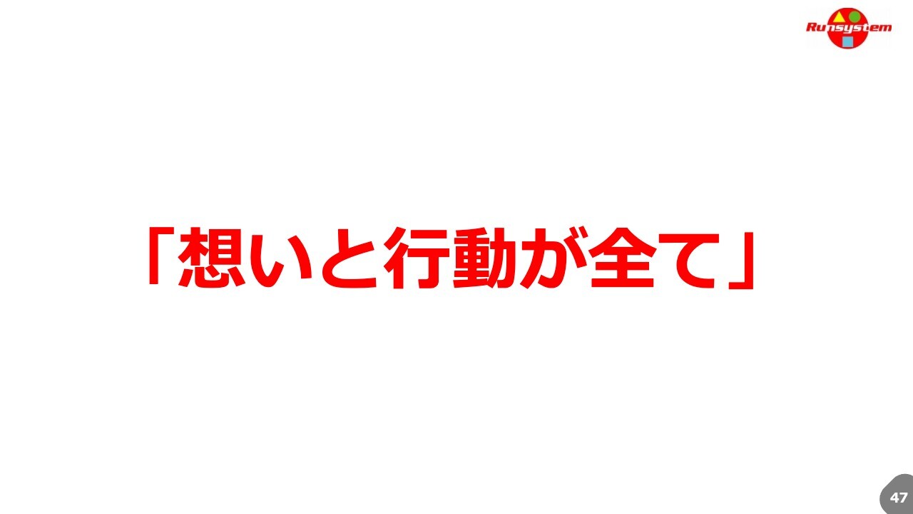 こちらは社内でよく話している内容ですが、基本の徹底をしっかり行う、想いを強くする、このような当たり前のことを実行しながら、会社全体の発展を目指していきます。ランシステムは本当に成長の可能性を秘めた会社であると、みなさまに理解いただくとともに、実際に成長していくという意識で取り組んでいきます。