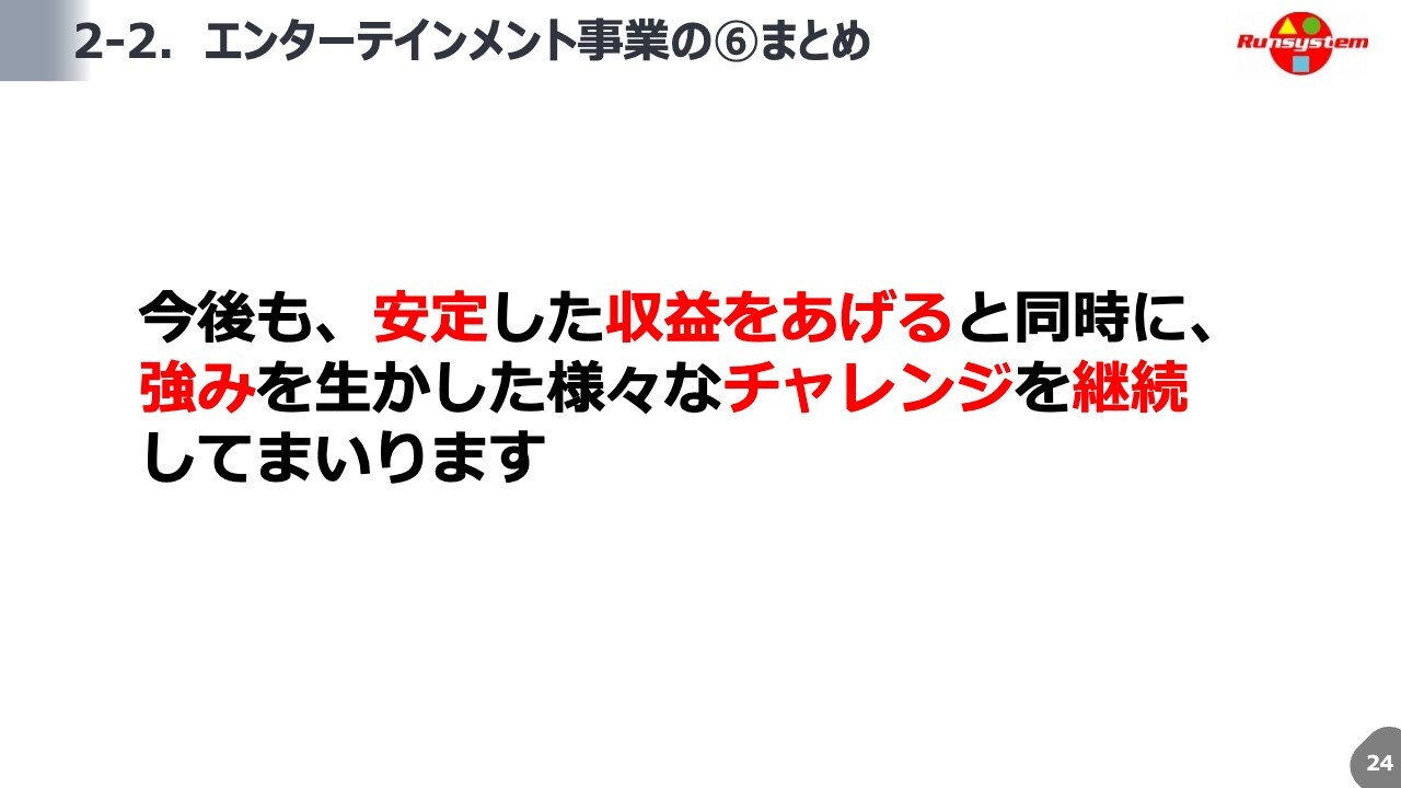 以上がエンターテインメント事業の強みです。今後は安定した収益をあげると同時に、この強みを活かしたさまざまなチャレンジを継続していきます。