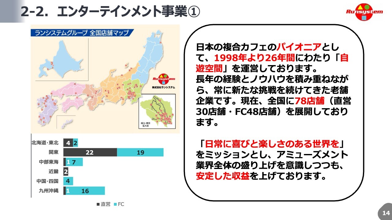 現在、全国で78店舗を運営しており、その内訳は直営30店舗、フランチャイズ48店舗です。先ほどお話ししたとおり、店舗は「日常に喜びと楽しさのある世界を」というミッションを掲げ、アミューズメント業界の活性化を意識しながら、収益面では非常に安定した成果を上げています。