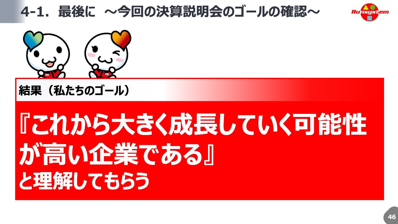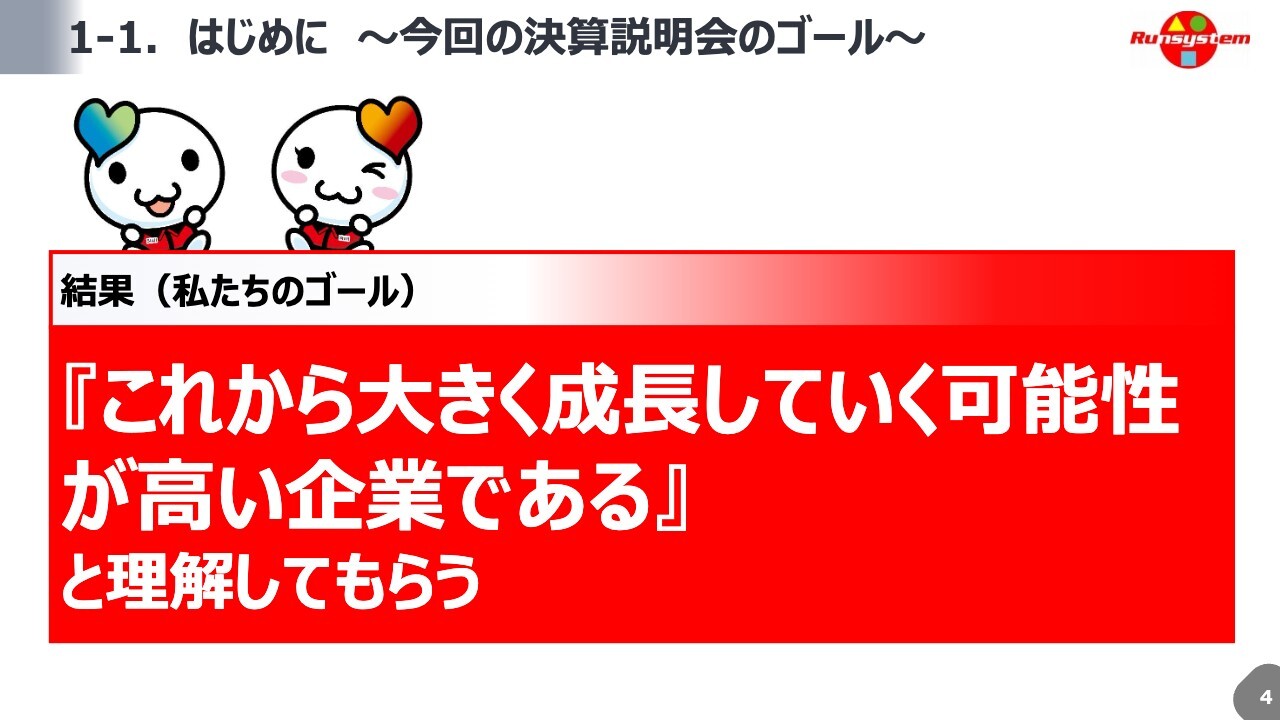 その結果として、当社ランシステムが大きく成長していく可能性が高い企業であることを、みなさまに理解していただく。これが我々の目指すゴールです。よろしくお願いします。