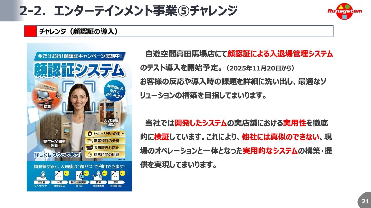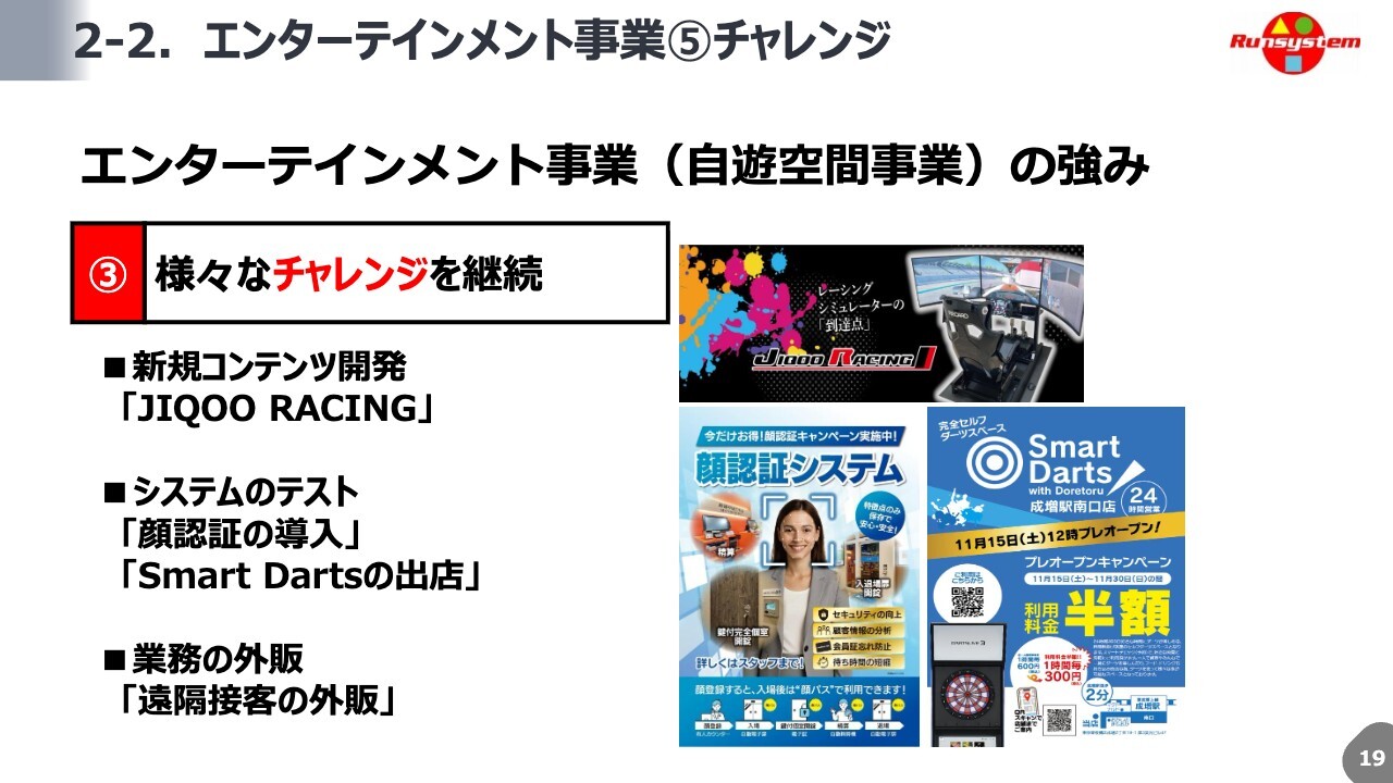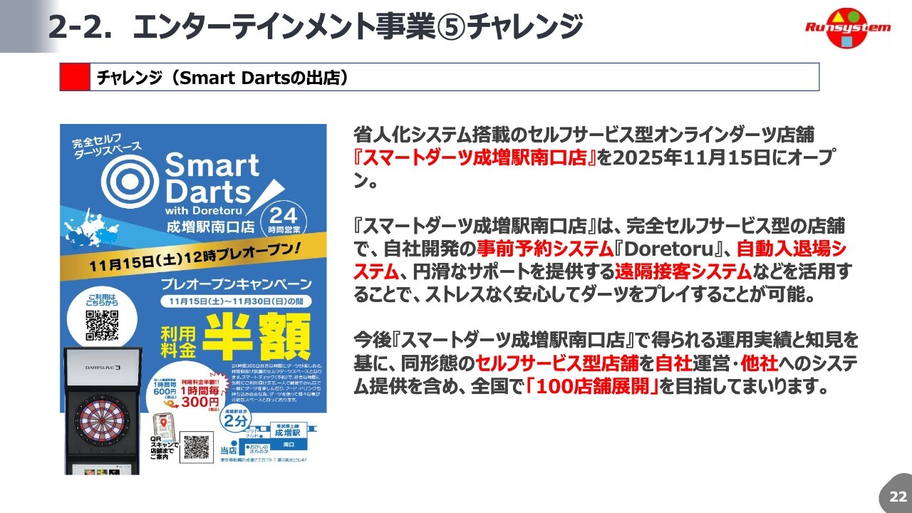 直近の取り組みでは、先日発表した上場維持基準適合に向けた進捗状況のほか、省人化システムを搭載したセルフサービス型オンラインダーツ店舗のリリースや、生体認証システムや顔認証システムの導入を発表しました。このような細かい発表を、今後さらに強化していきたいと考えています。