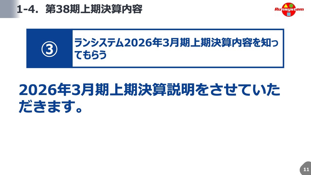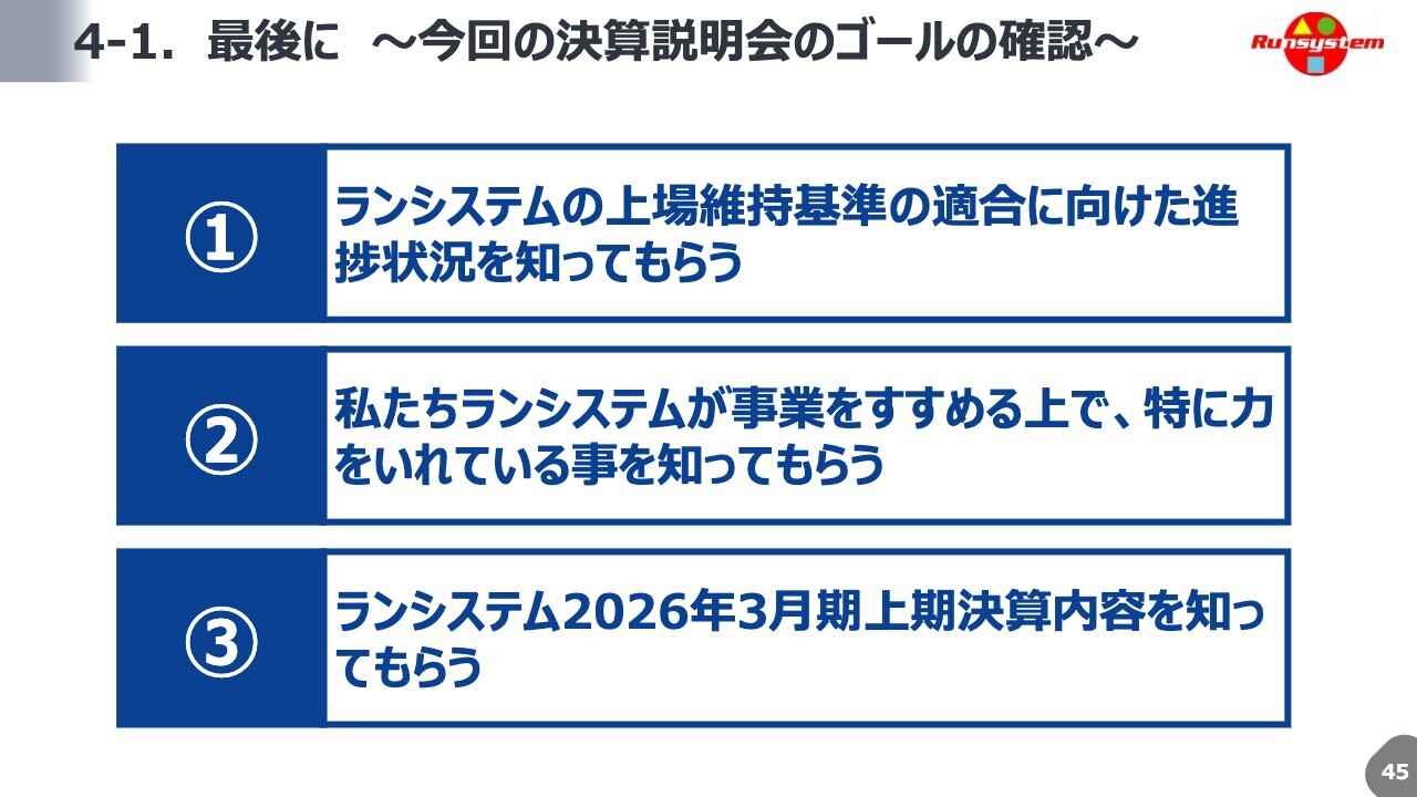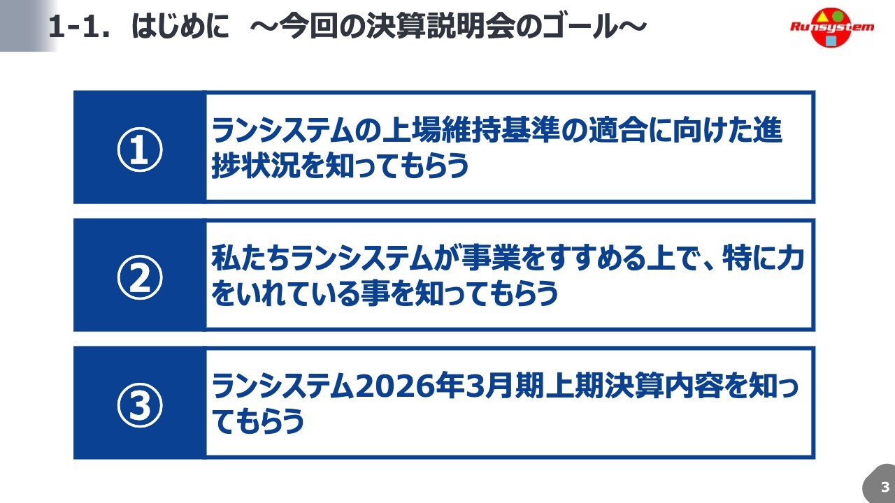 本日の決算説明会のゴールとして、3つの項目を掲げています。1つ目は、ランシステムの上場維持基準への適合に向けた進捗状況をお伝えすること、2つ目は、私たちランシステムが事業を進める上で特に力を入れている点を知っていただくこと、3つ目は、ランシステムの2026年3月期上期決算内容をお伝えすることです。