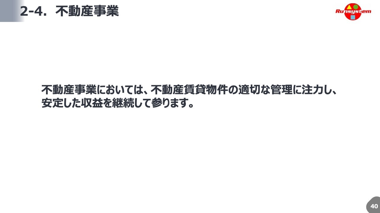 不動産事業についてです。不動産事業では、不動産賃貸物件の適切な管理に注力し、安定した収益を継続していきます。