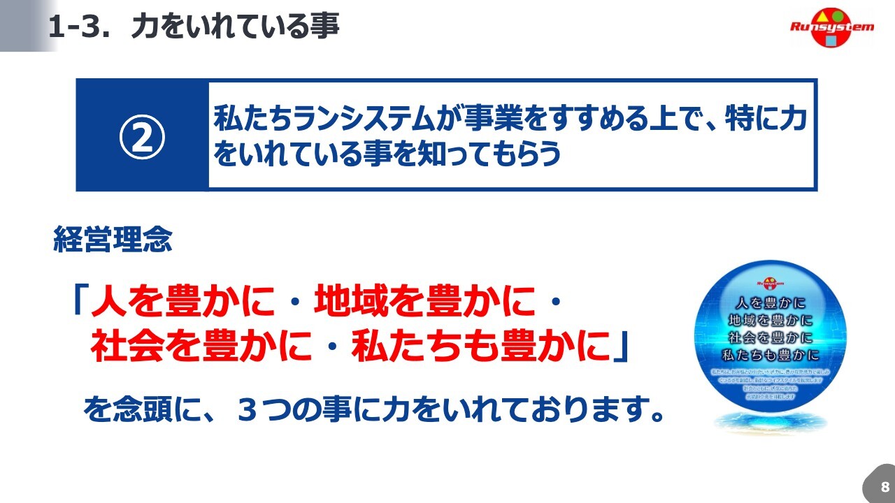 本日は、こちらを特にみなさまにお伝えしたいと考えています。我々の経営理念は「人を豊かに・地域を豊かに・社会を豊かに・私たちも豊かに」の4つを掲げており、この経営理念を念頭に置きながら、現在3つの重点事項に力を入れて事業を進めています。