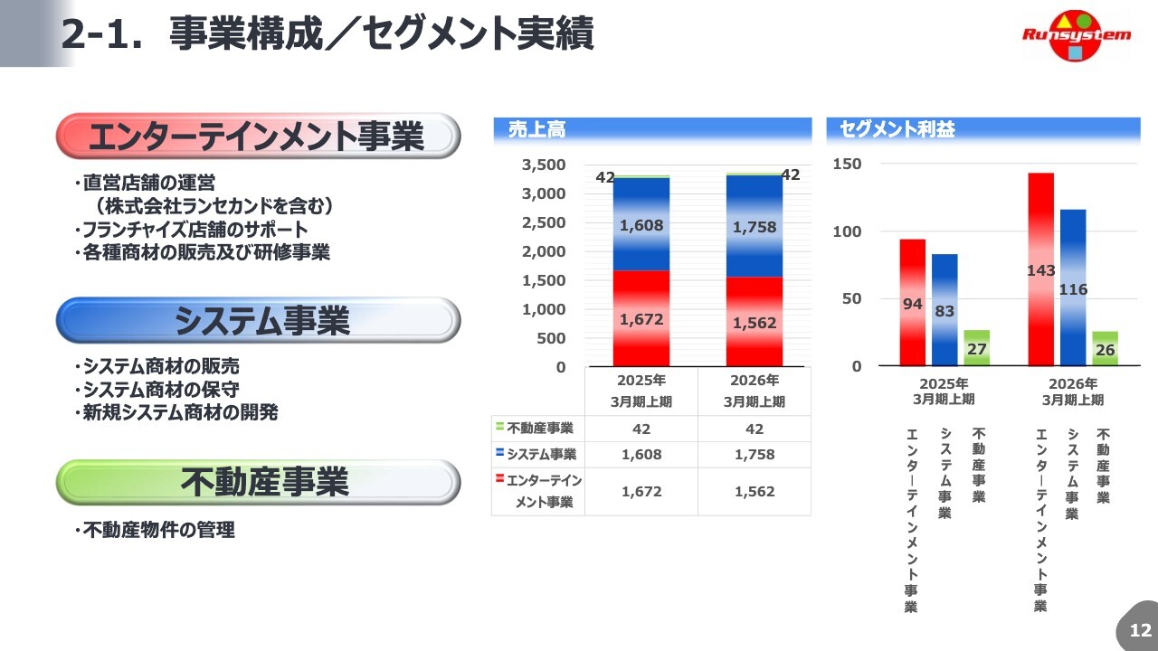 今回の決算説明です。当社の事業は大きく3つに分かれます。エンターテインメント事業、システム事業、そして不動産事業です。スライド12ページに各セグメントの実績が記載されていると思いますが、エンターテインメント事業とシステム事業は売上や利益がしっかりと出ており、おおむね順調に推移しています。