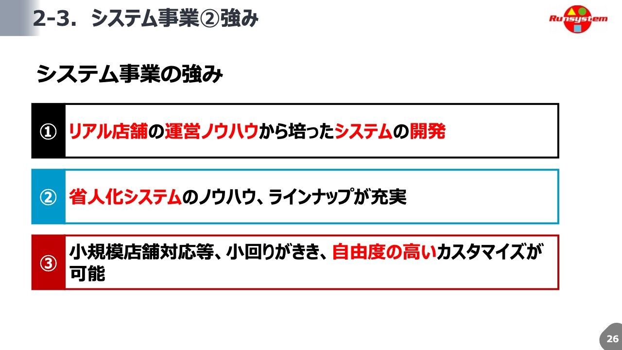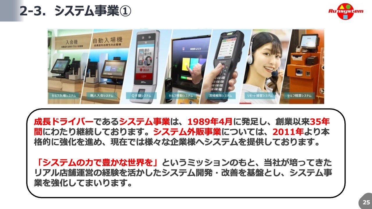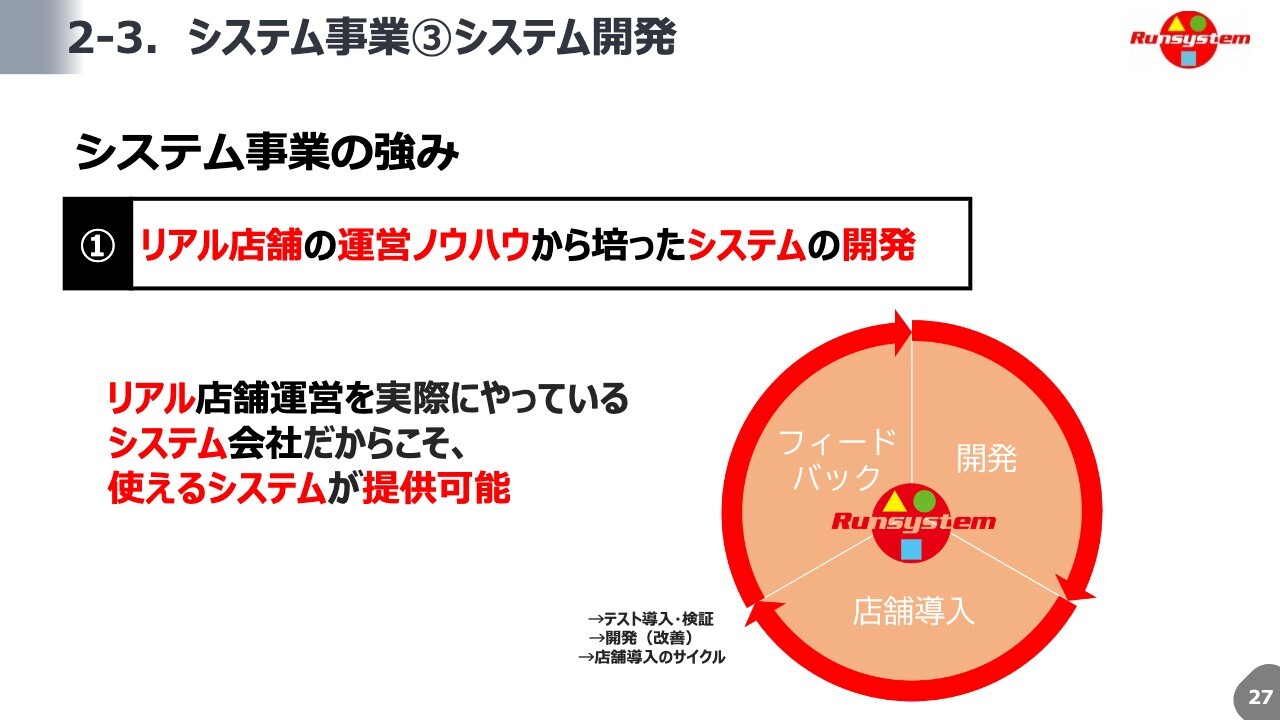 1つ目、当社はリアル店舗運営を活用したシステムの開発や改善を基盤に、システム事業を強化していきます。