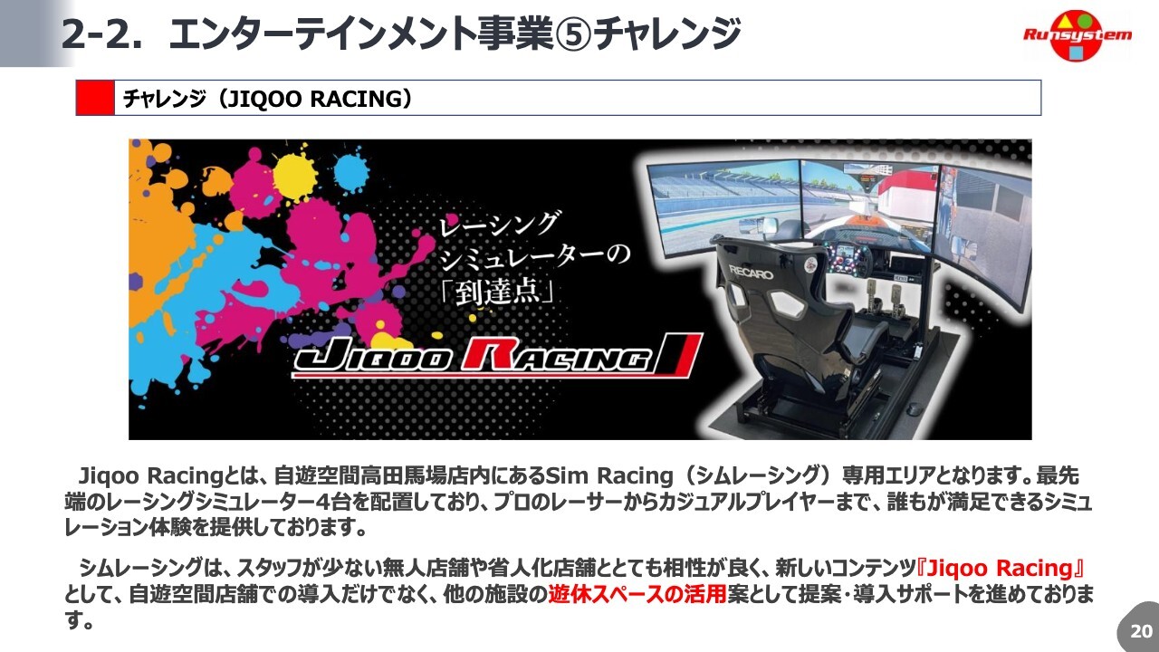 1つ目のチャレンジは「JIQOO RACING」です。こちらは「Sim Racing」というシミュレーションレーシング機器で、「自遊空間」高田馬場店内に「SIM Racing」専用エリアを設置しています。遊休スペースを活用し、レーシングシミュレーターを4台設置しました。これにより、プロレーサーからカジュアルレーサーまで、さまざまな方が利用できる空間を提供しています。