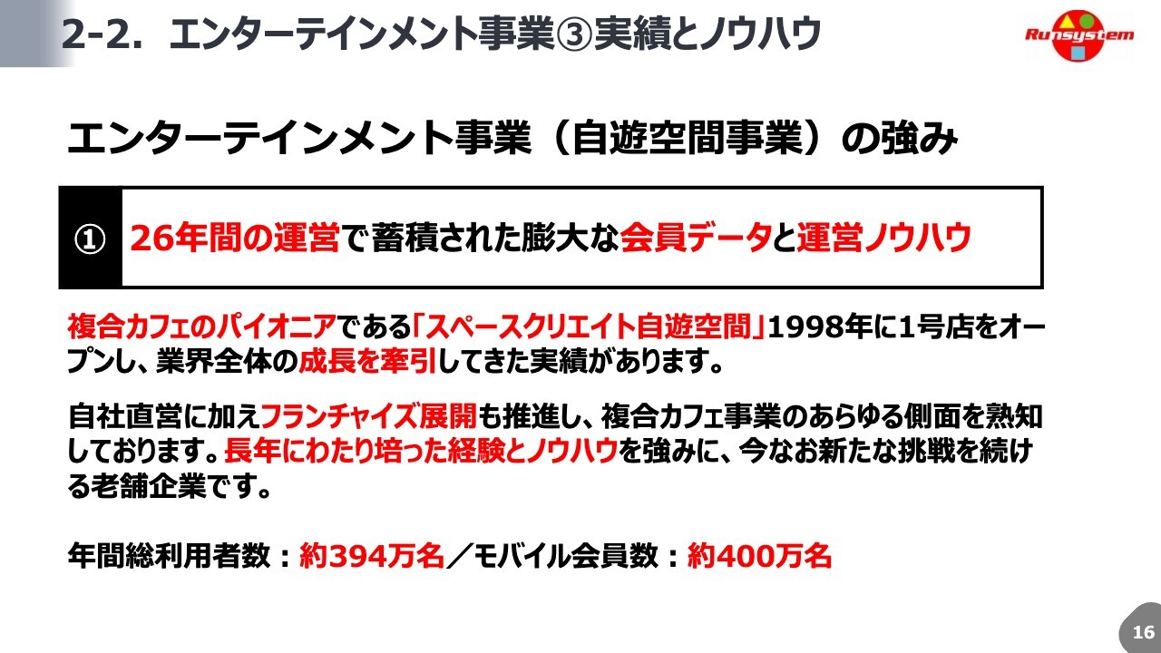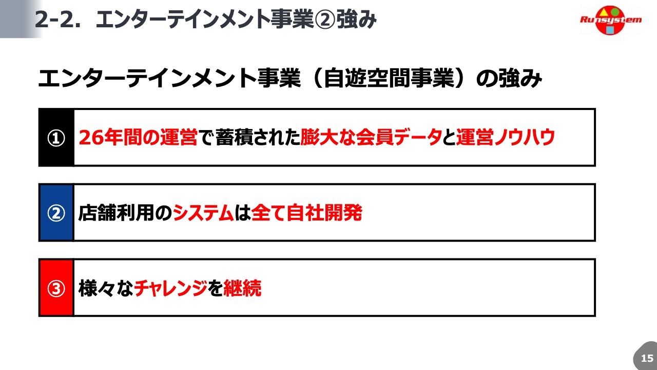 アミューズメント事業には3つの強みがあります。まず1つ目は、26年間の運営で蓄積された膨大な会員データと運営ノウハウです。