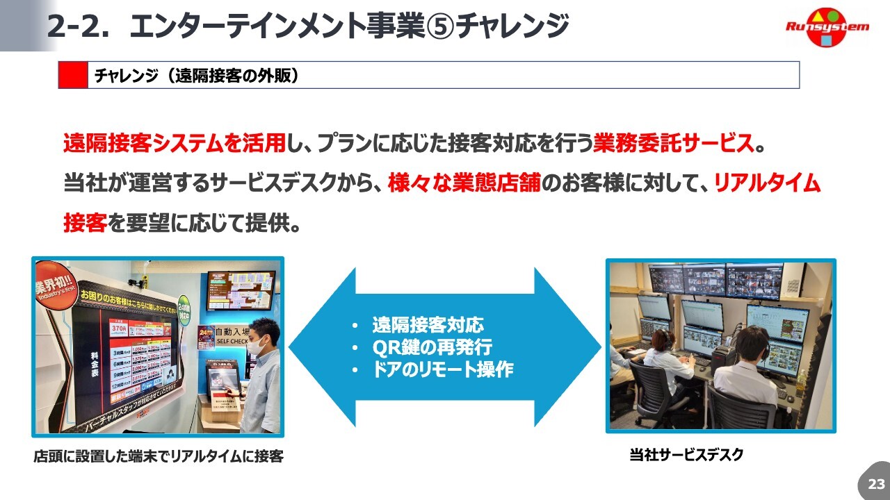 具体的には、遠隔接客システムを活用し、プランに応じた接客対応を行う業務委託サービスとなります。さまざまな業態の店舗のお客さまに対し、リアルタイムで要望に応じた接客を提供する内容です。ホテルなど、一部の企業ではすでに導入・活用されているため、今後はチャレンジとしてしっかりと伸ばしていく予定です。
