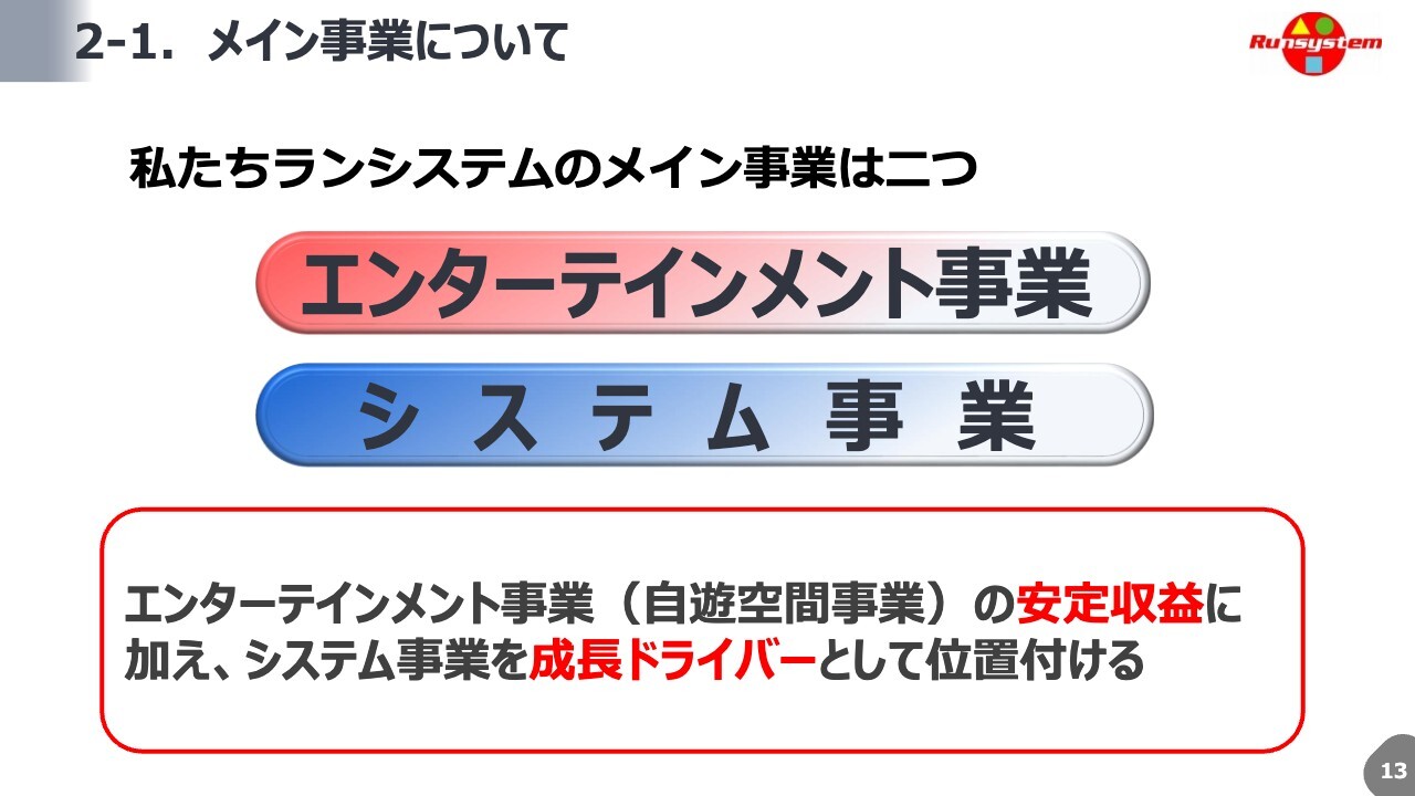本日はメイン事業について詳しくご説明します。当社のメイン事業は2つあります。エンターテインメント事業とシステム事業です。我々は、エンターテインメント事業である自遊空間事業を安定収益の基盤とし、システム事業を成長ドライバーとして位置づけています。