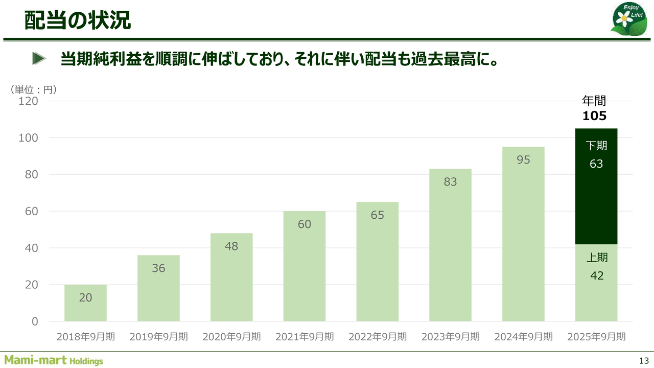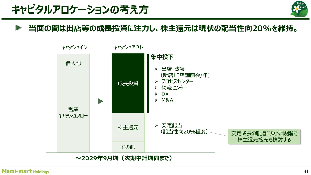 そのため、株主還元については、配当性向を当面20パーセントに維持する方針です。一定の割合で店舗を出店し、売上規模を拡大させることで、出店投資のインパクトが売上増加により軽減されます。その際に、株主還元の見直しを改めて検討したいと考えています。