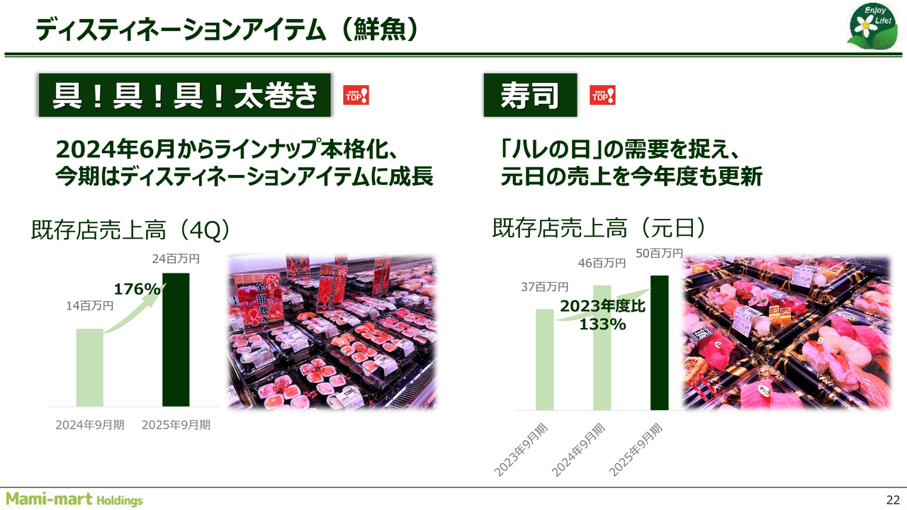 スライド右側は寿司です。当社は珍しく、1月1日も営業しています。その1月1日の売上高が、2023年度から2025年度9月期までの既存店で133パーセントの伸びとなっています。寿司は家庭でなかなか作ることが難しいため、お店へ買いに行く需要があります。