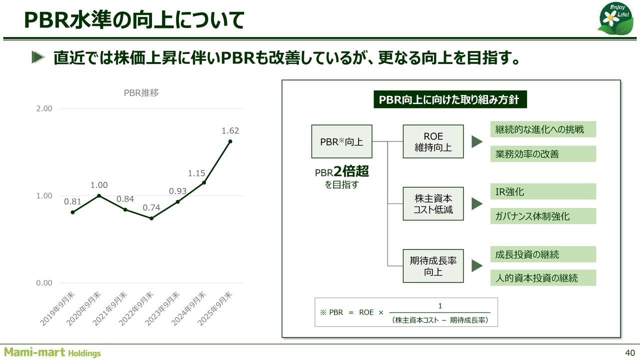 この2倍を目指すためには、スライドにも記載のとおり、ROEの維持向上、株主資本コストの低減、期待成長率の向上などの取り組みが重要です。ただし、基本的には私たちの経営が安定しており、業績をしっかりと残していることが、PBR向上の最も重要な要素だと考えています。