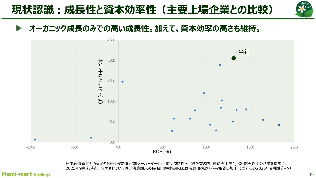 成長性と資本効率についてです。スライドのグラフの横軸はROE、縦軸は対前年売上伸長率を示しています。この図でお伝えしたいのは、売上が非常に伸びている中でも、高いROEを維持できている点です。