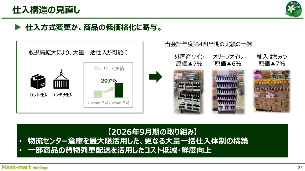 仕入構造改革は、先ほどお話しした、コンテナでの仕入に関する取り組みです。安く販売するためには、安く仕入れることが重要ですので、このような取り組みをさらに強化していきたいと考えています。
