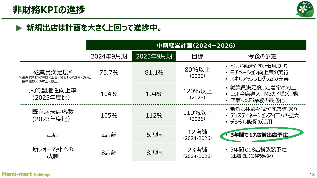 伸び率について、現在のところ104パーセントと、まだ努力目標にとどまっており、さらなる取り組みが必要な状況です。既存店来店客数については、2023年度比で目標が110パーセントでしたが、現時点で112パーセントを達成しており、目標をクリアしています。