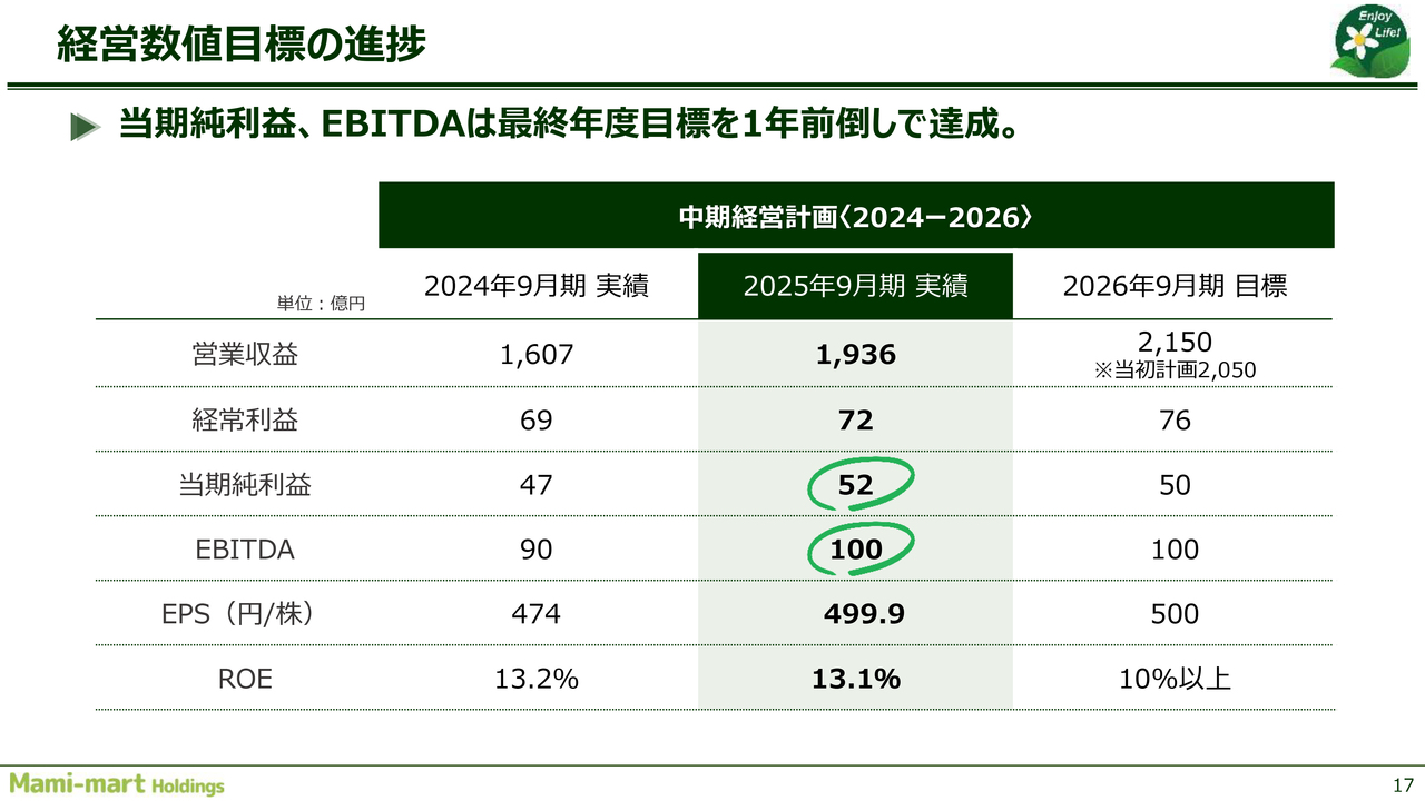 中期経営計画の進捗状況についてお話しします。スライド右側に、2026年9月期の目標を記載しています。2年目の時点で、当期純利益とEBITDAについては目標を達成しています。さらに目標を伸ばしていく必要があると考えています。