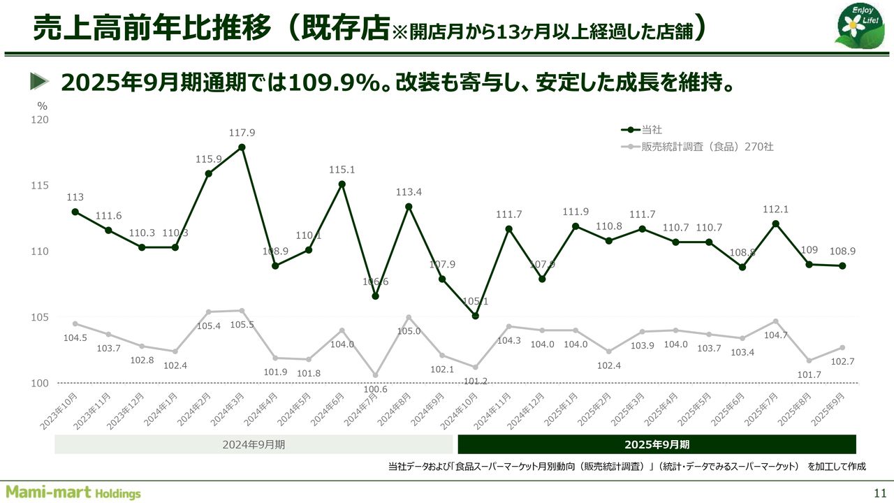 スライドは、売上高前年比推移を示したグラフです。年間ベースでは、既存店の売上高増加率が109.9パーセントでした。下の線グラフは、食品スーパーマーケット月別動向として、「統計・データでみるスーパーマーケット」から抜粋したデータを使用しています。