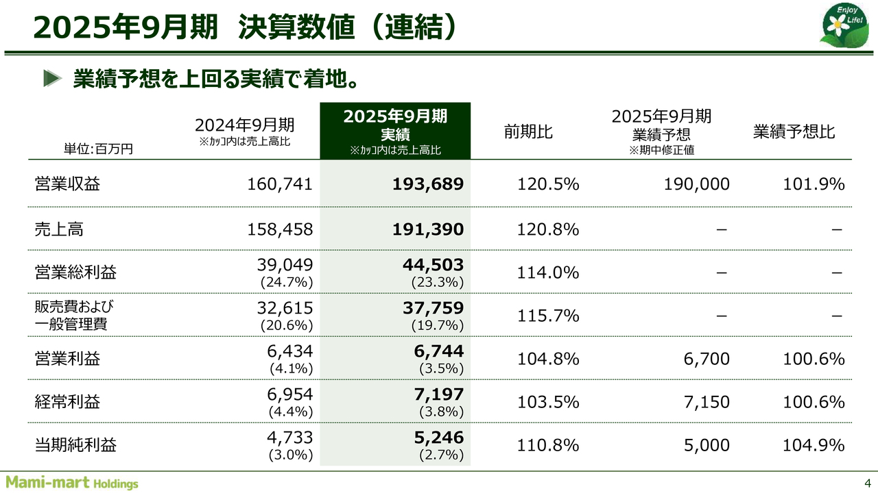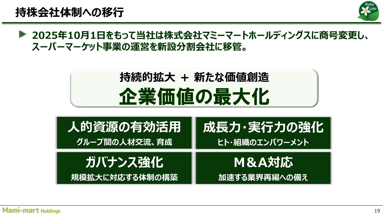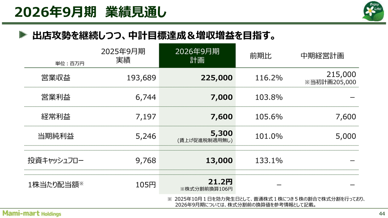 当期純利益は若干上方修正し、53億円を目標としています。スライドに記載した「賃上げ促進税制適用無し」については、今期より持株会社制に移行したため、マミーマートは新しく設立した新会社となります。