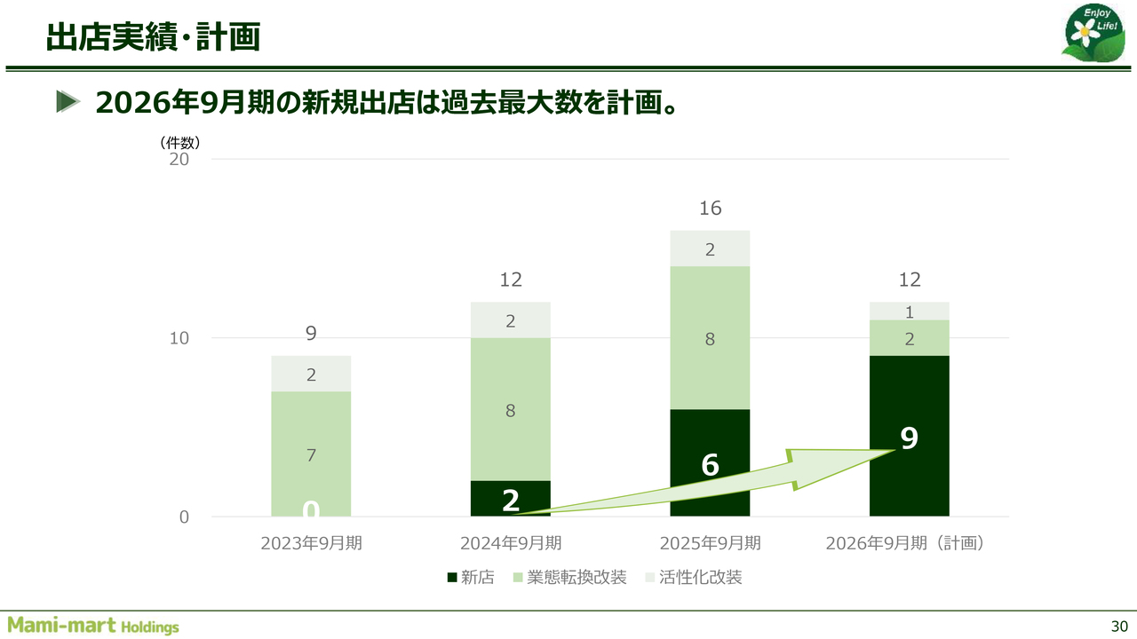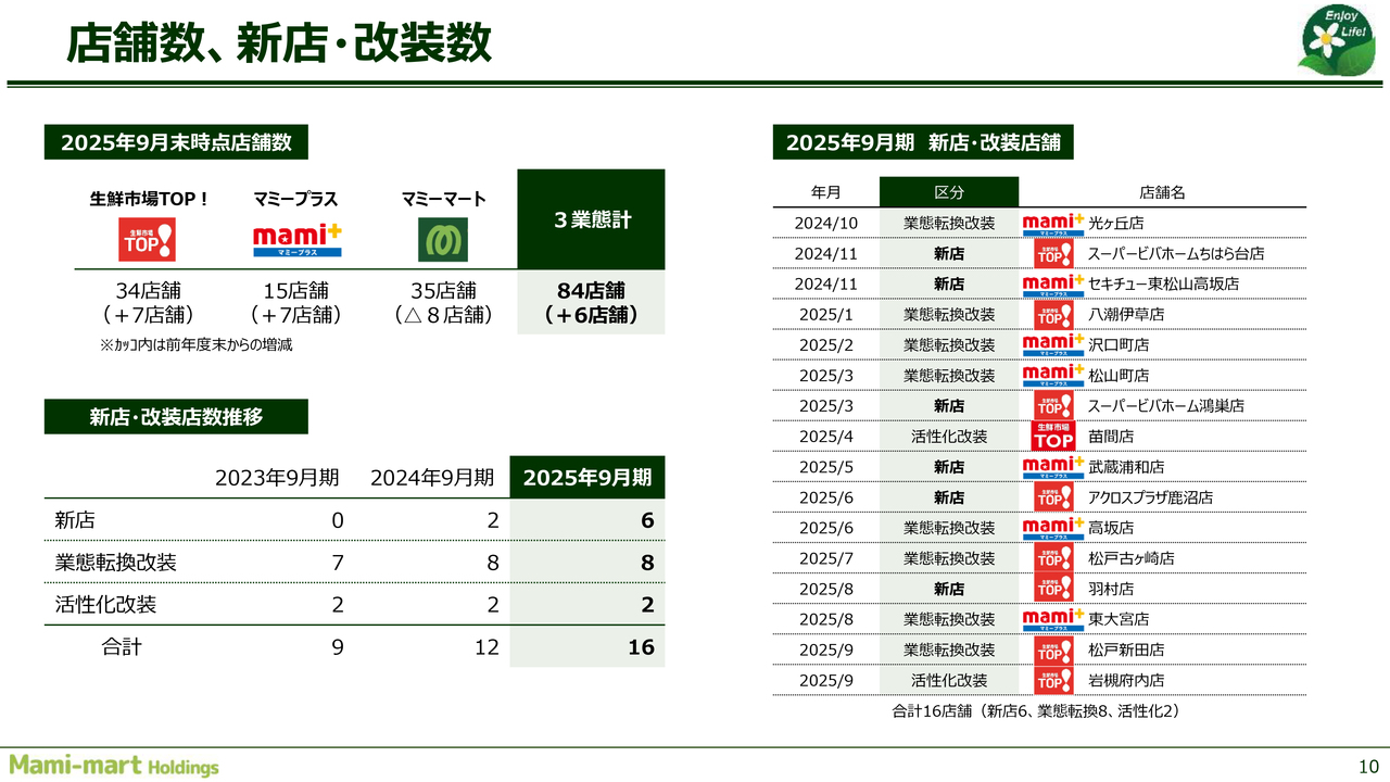 店舗数および新店・改装店についてご説明します。現在、「生鮮市場TOP!」は7店舗増加し、34店舗となりました。「マミープラス」も7店舗増加し、15店舗です。「マミーマート」はマイナス8店舗となっていますが、これは改装により「生鮮市場TOP!」や「マミープラス」に業態転換したことによるものです。