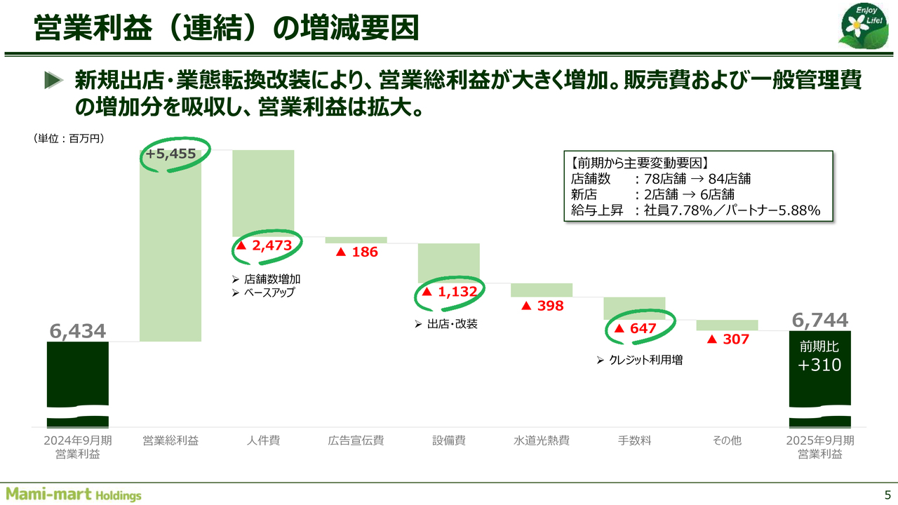 営業総利益については、54億5,500万円のプラスとなっていますが、それ以外のコストについてもお伝えします。特に人件費については、24億7,300万円の増加が見られます。この要因としては、賃上げを実施していることに加え、新店舗の出店があります。