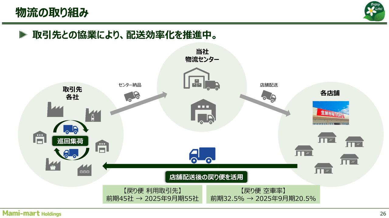 近隣のメーカーから商品を集荷し、そのままトラックの戻り便で当社の物流センターに運び込むという方法です。前期では、この取り組みに参加しているメーカーが45社でしたが、現在では55社に増加しています。
