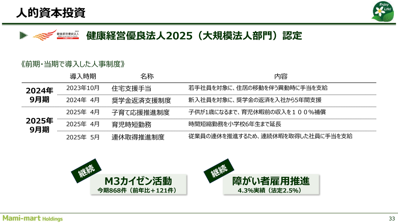 スライド下に記載されている「M3カイゼン活動」は、単純な改善活動です。この活動はさらに継続しており、今期のエントリー数は868件で、前期と比べて121件増加しました。また、障がい者雇用については、引き続き法定の2.5パーセントを上回る水準で雇用を継続していきたいと考えています。