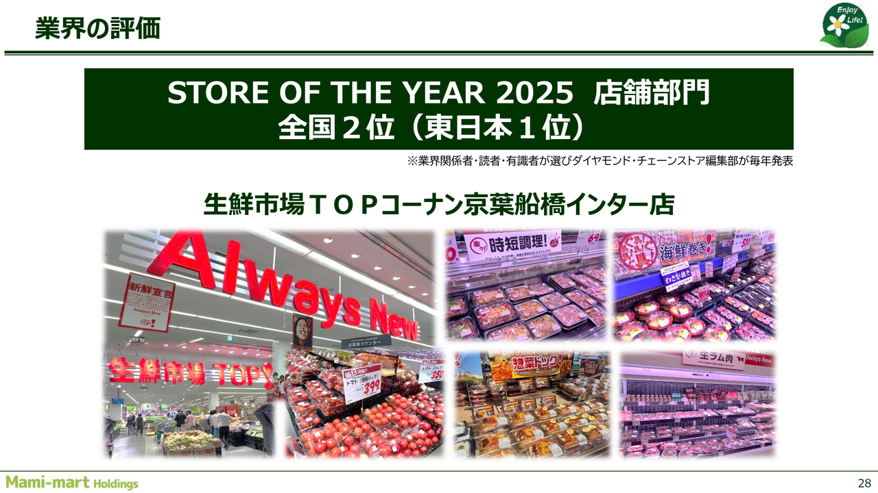 「STORE OF THE YEAR 2025」についてです。「ダイヤモンド・チェーンストア」において、業界関係者や読者、有識者が選出したものですが、私たちは業界からの評価と捉えています。この中で、昨年オープンした「生鮮市場TOP!」のコーナン京葉船橋インター店が選ばれました。