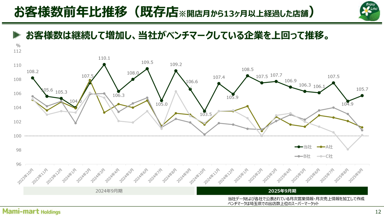 お客さまに関するデータです。客数の前年比について公表しており、少しわかりづらいのですが、スライドに記載されているA社、B社、C社は、埼玉県内にあるスーパーとの比較となっています。