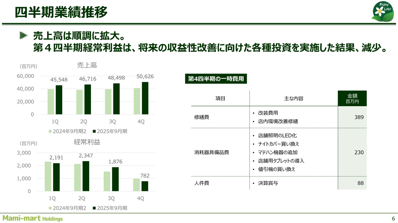 具体的には、4店舗の改装と修繕を行い、これに関連する一時経費が3億8,900万円発生しました。また、消耗器具備品費として2億3,000万円程度を計上しています。これには、店舗のLED化やナイトカバーの設置などが含まれています。また、店舗をきれいに保ち、省エネ効果を狙った先行投資も行いました。