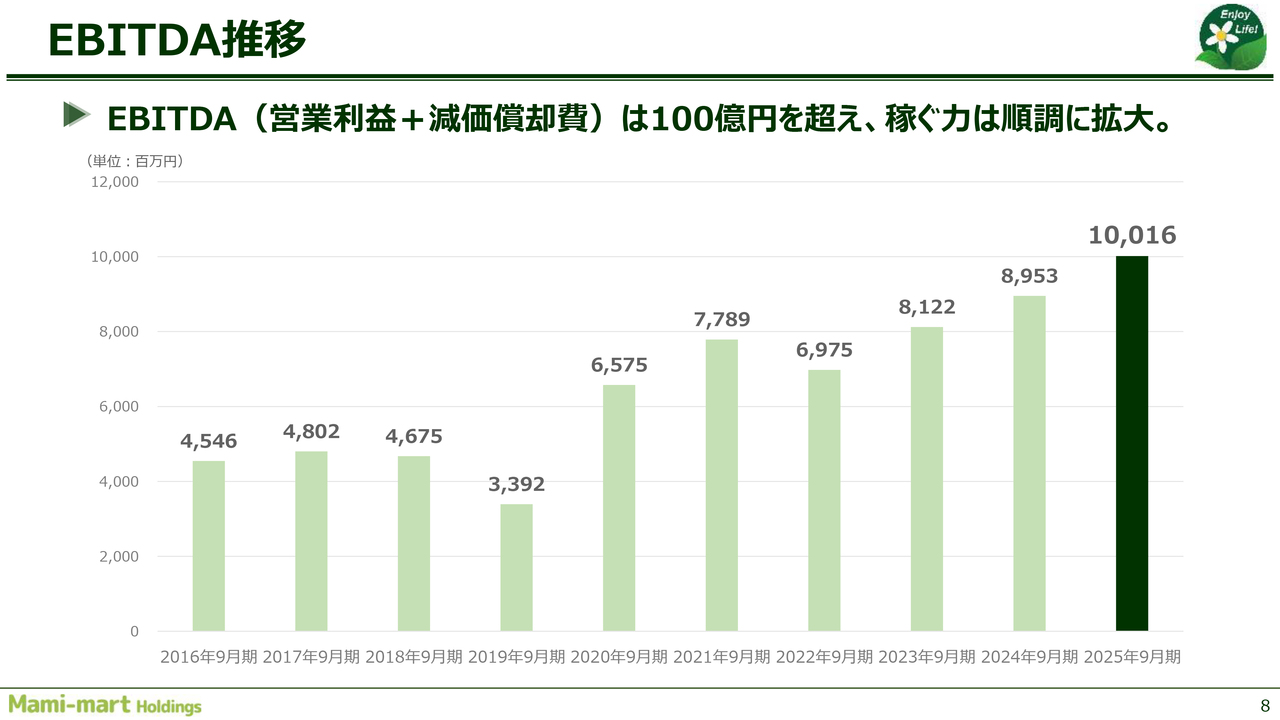EBITDAの推移についてです。今期は100億円を超え、順調に拡大しています。