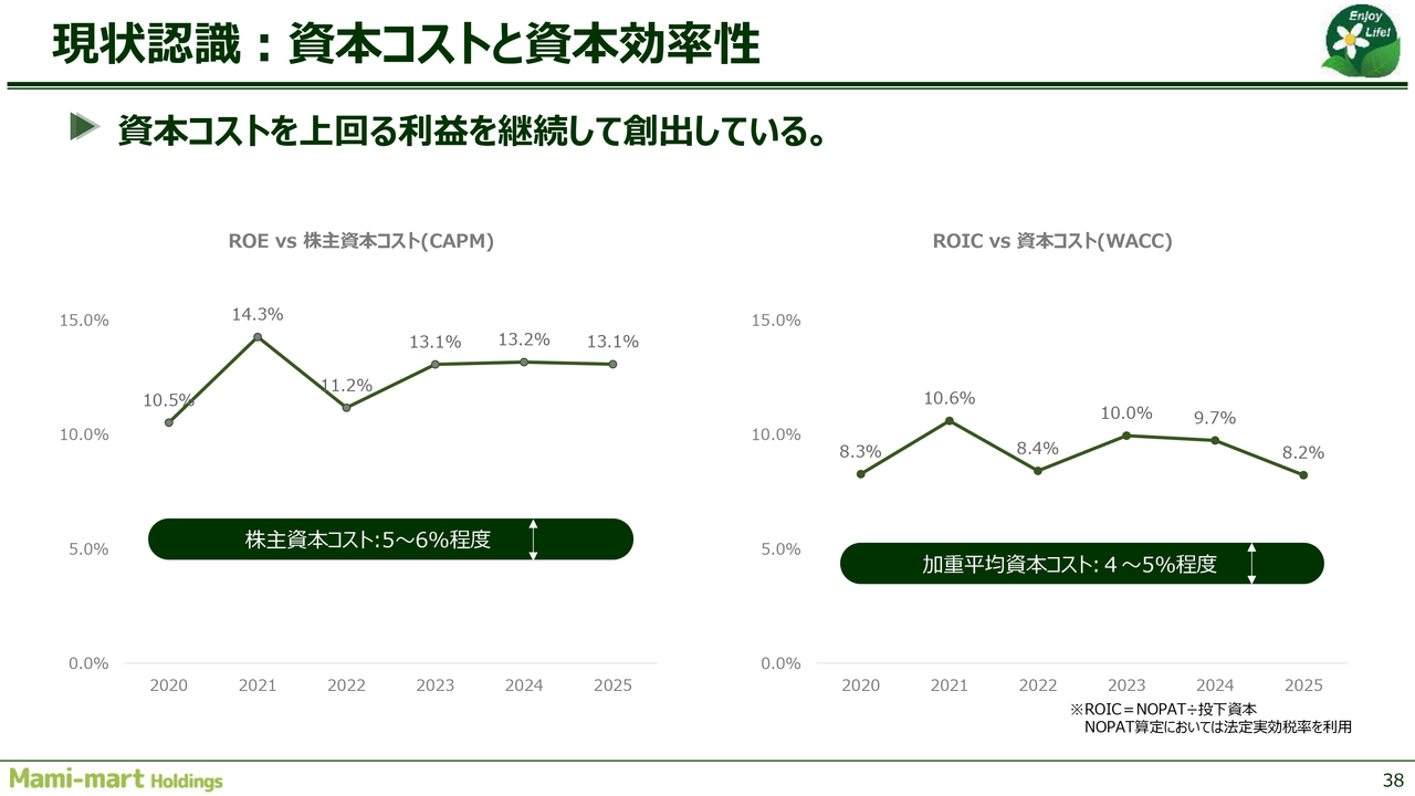 ROEに関しては、折れ線グラフで2020年からの推移が示しており、高い水準で推移していると考えています。株主資本コストについては、恣意的な部分もあるためレンジで示されていますが、約5パーセントから6パーセントと考えています。このことから、ROEが株主資本コストを上回っています。