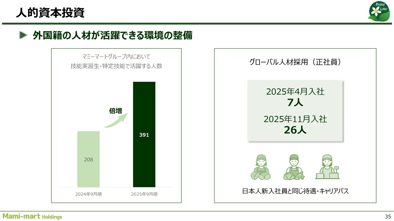 人手不足の中で、外国人人材を戦略的に活用していこうと考えています。2024年9月期に比べ、技能実習生や特定技能で活躍する人材が約倍増しています。鮮魚、惣菜、精肉の3部門で受け入れが可能で、対応を進めています。