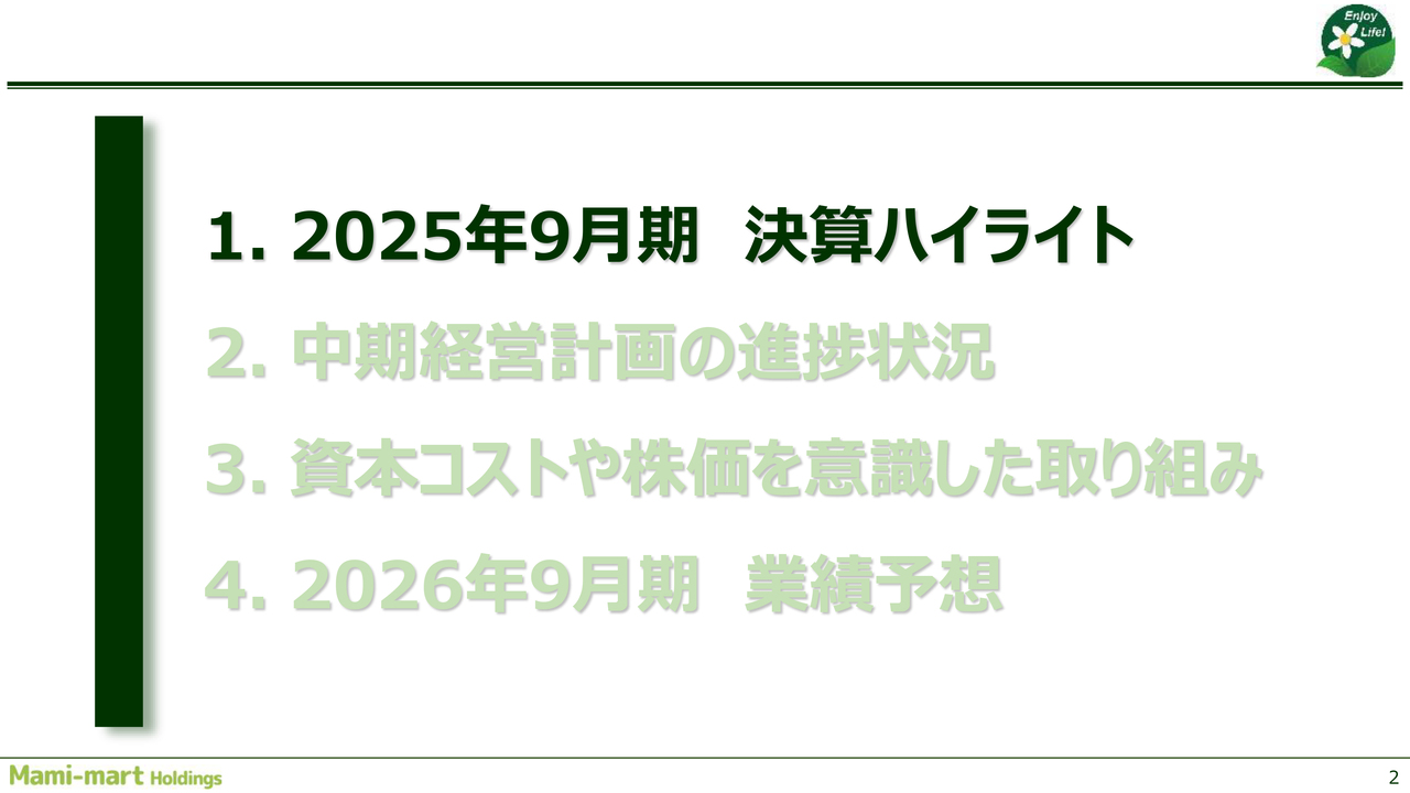 岩崎裕文氏(以下、岩崎):株式会社マミーマートホールディングス代表取締役社長の岩崎です。さっそく、目次に沿ってご説明したいと思います。