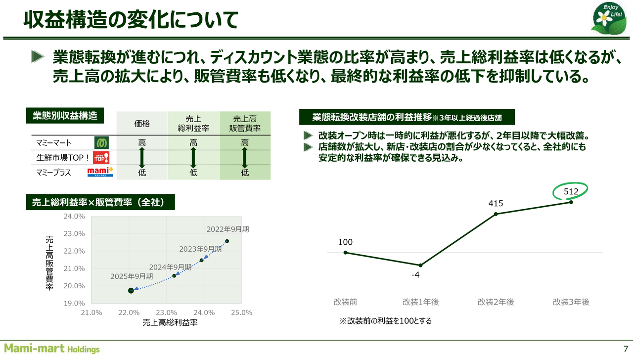 収益構造の変化についてお話しします。先ほども触れましたが、現在3つの業態があり、新しい業態である「生鮮市場TOP!」と「マミープラス」によって、先期末時点で約6割の店舗がこの新業態に移行しています。