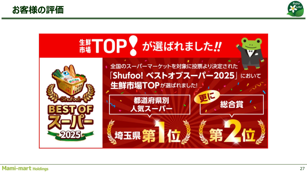お客さまの評価についてです。さまざまな取り組みの結果として、ネットでチラシを見るサイトである「Shufoo!」が主催する「ベストオブスーパー2025」において、埼玉県で1位、さらに全国でも総合賞として2位を獲得しました。