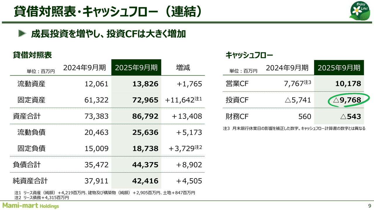 貸借対照表についてご説明します。特筆すべきトピックは大きくありませんが、新規出店や設備投資を行っていることもあり、固定資産が大きく増加しています。固定負債では、リース債務が出店に伴い増加しています。投資キャッシュフローについては、2024年9月期と比較すると、倍近い規模で投資を行っていることが確認できます。