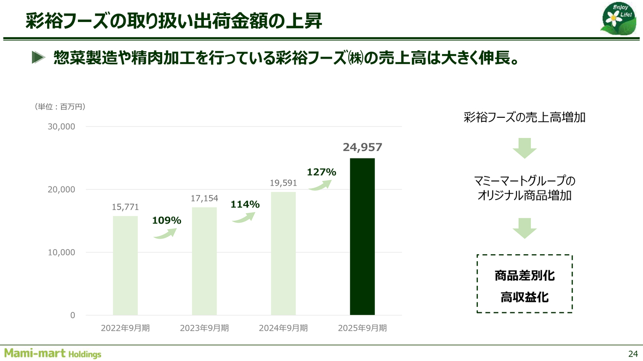 彩裕フーズです。取り扱い出荷金額が増加しています。現在、彩裕フーズでは精肉と惣菜の商品を製造していますが、売上全体の伸びを上回るペースで推移しています。